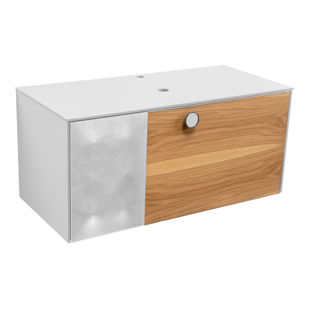 De hangmodule beschikt over een interne lade : de eerste met een afvoer, voorzien van verdelers en een eikenhouten frontpaneel, de tweede met een grote opbergruimte.