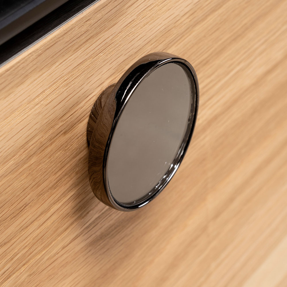De buitenste lade is voorzien van een gepolijste metalen handgreep met een spiegel in dezelfde afwerking.