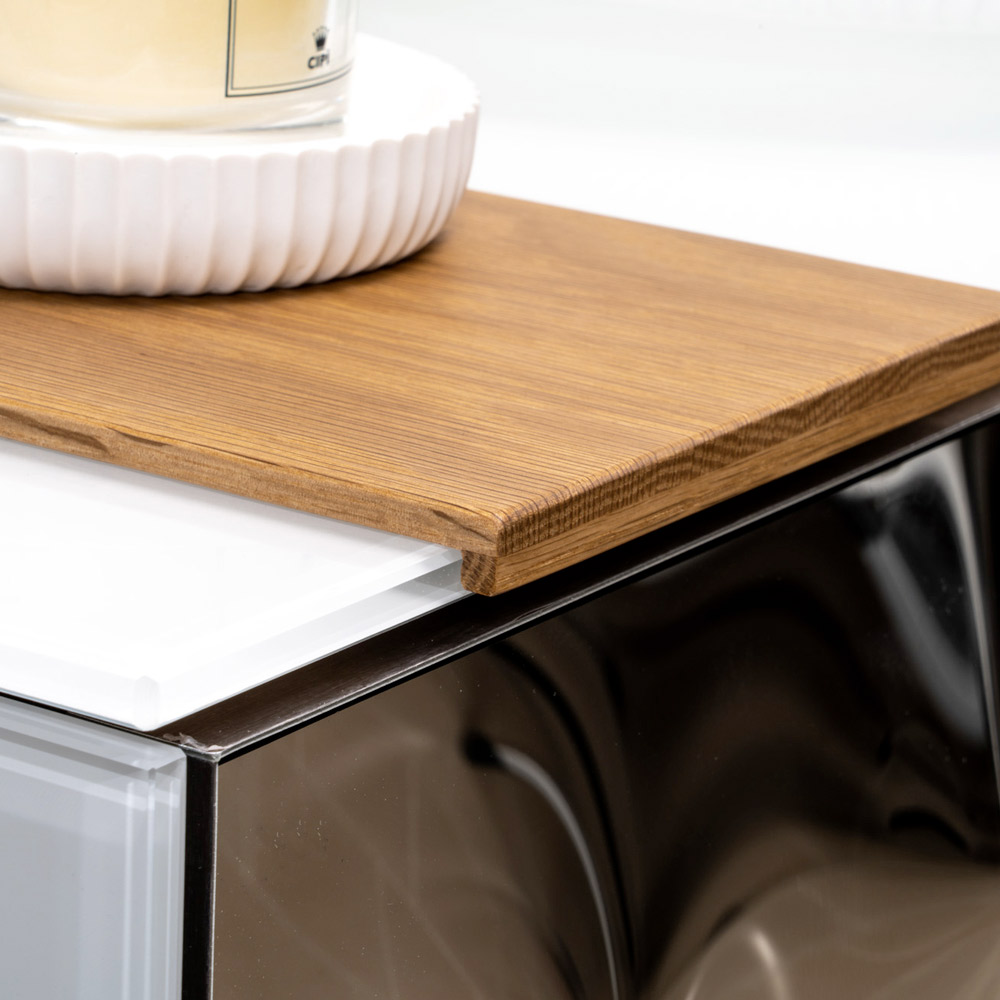 Het centrale deel van natuurlijk hout met zichtbare nerfstructuur combineert harmonieus met de bovenkant en zijkanten van 8 mm extra helder gehard gekleurd glas . De zijkanten van de lade zijn van gebogen glas , wat zich kenmerkt door een driedimensionaal effect met lichtgevende reflecties, waardoor het ontwerp wordt verrijkt met een onderscheidend en verfijnd detail.