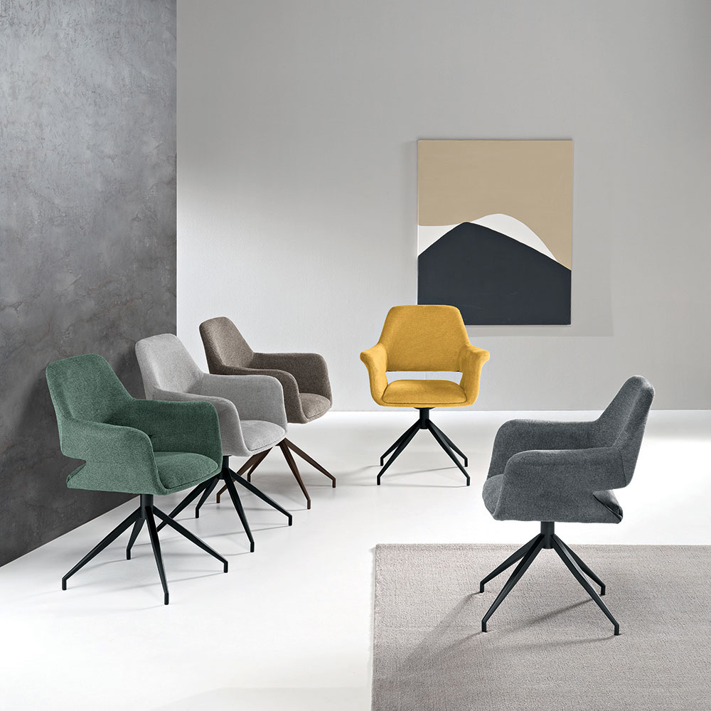 Een elegante set van twee gestoffeerde draaistoelen met een modern design, ideaal voor een stijlvolle inrichting van uw eetkamer , woonkamer of andere ruimte. De stoffen bekleding geeft de stoelen een verfijnde en uitnodigende uitstraling, perfect voor een eigentijdse omgeving.