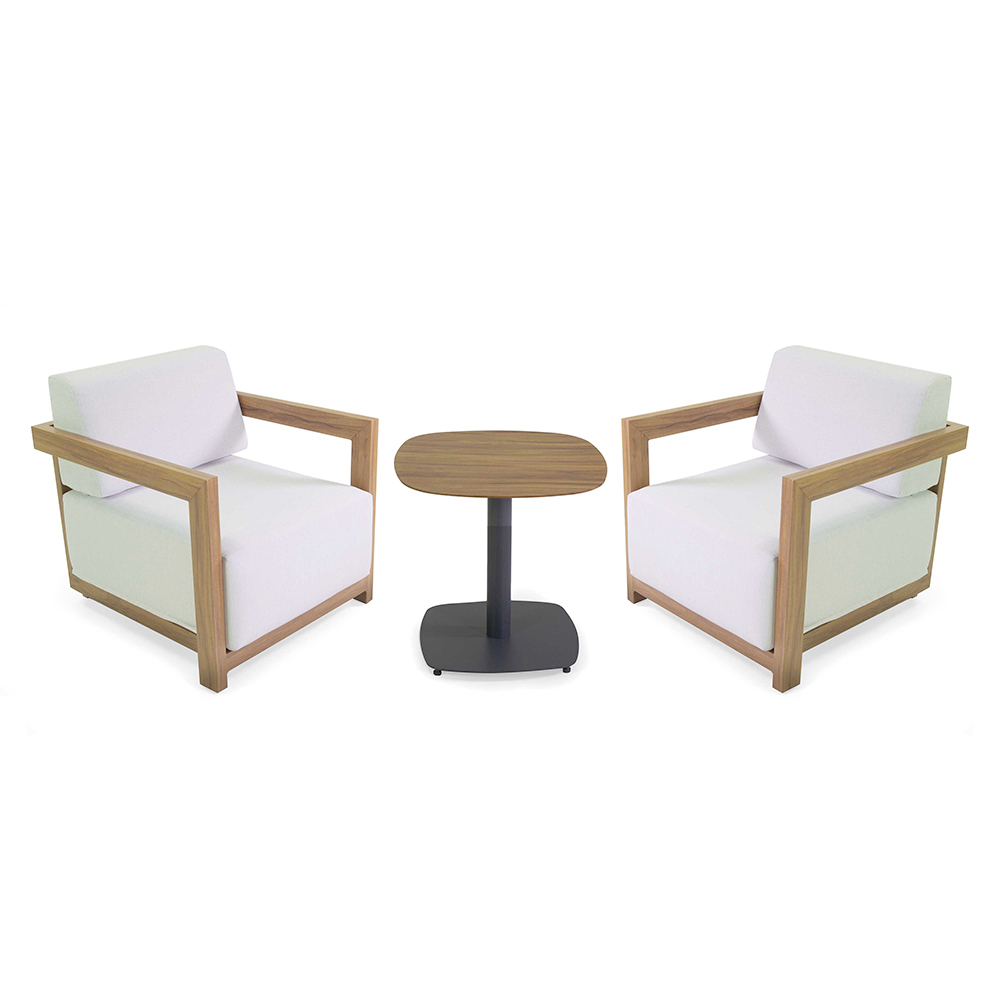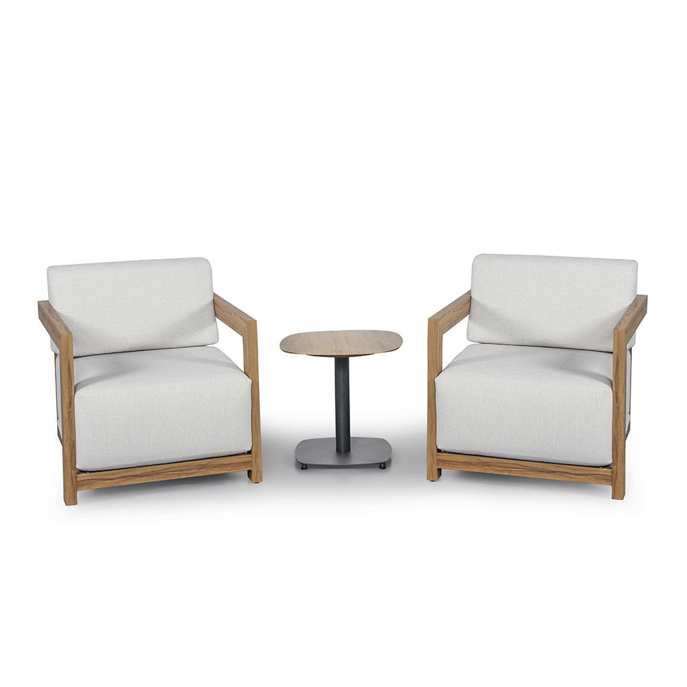 Deze lounge set is de belichaming van hedendaagse elegantie, perfect voor het creëren van een gastvrije en verfijnde sfeer in elke buitenruimte. Elk stuk combineert strakke lijnen en materialen van hoge kwaliteit, met een stevig houten frame en gezellige kussens in weerbestendige stof, die zorgen voor langdurig comfort en minimaal onderhoud.