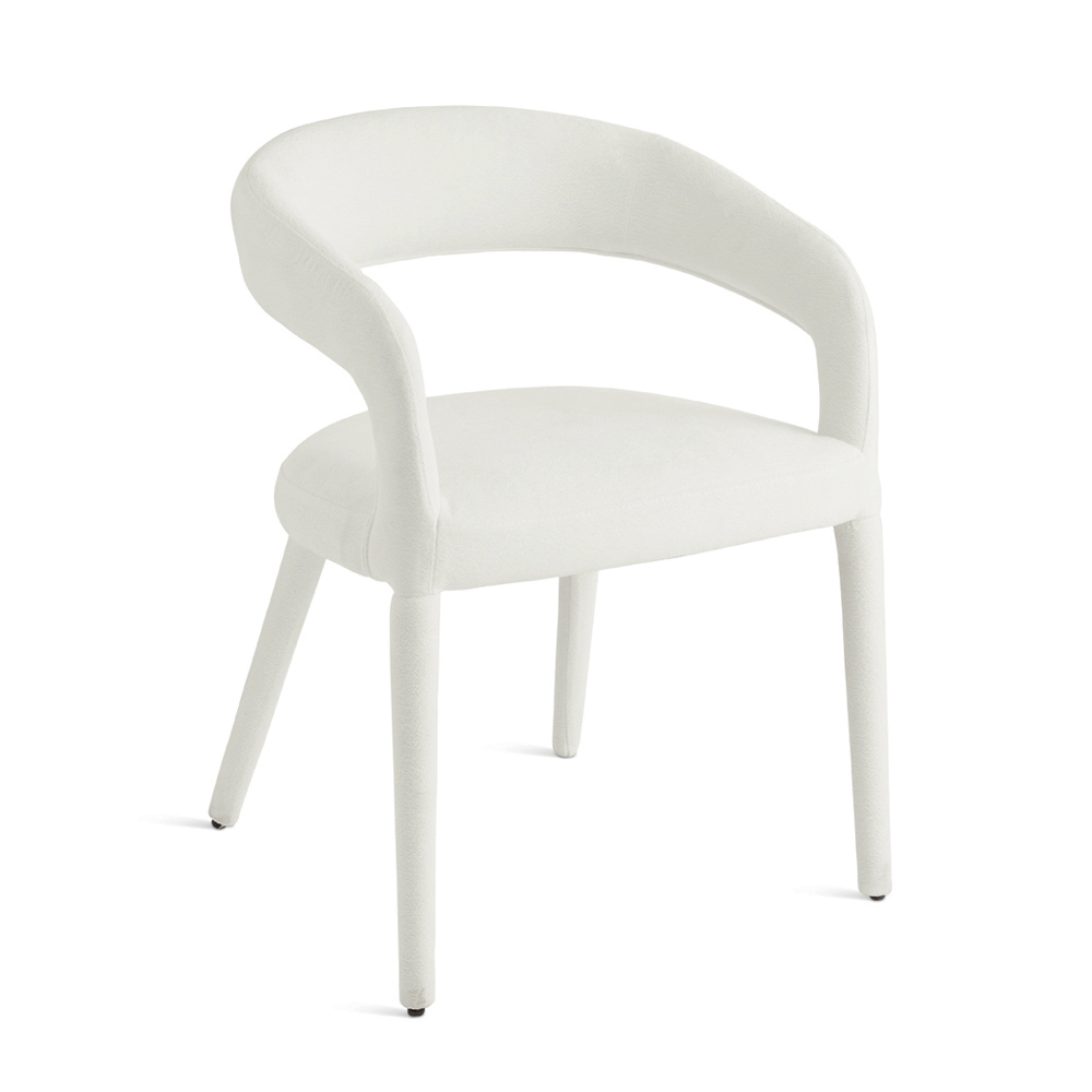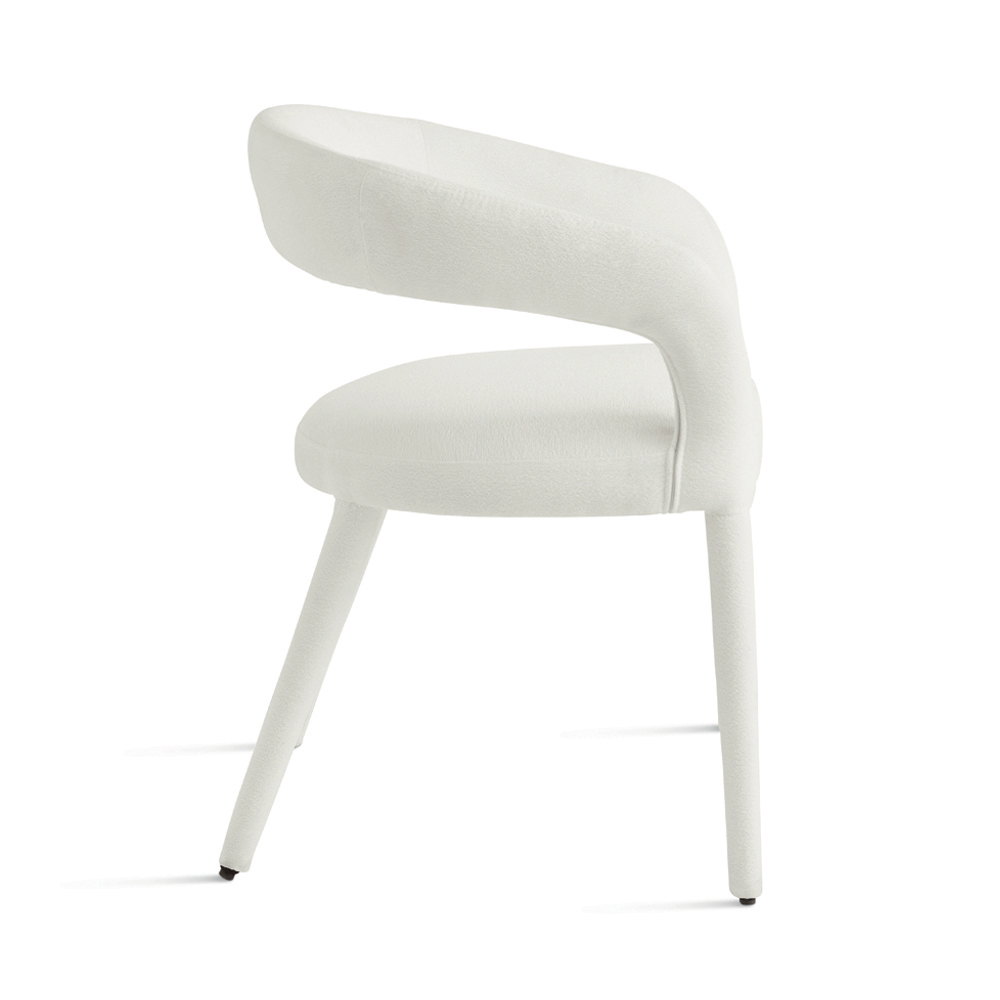 Een elegante set van twee gestoffeerde stoelen met een eenvoudig, eigentijds ontwerp, ideaal voor een stijlvolle inrichting van uw eetkamer , woonkamer of andere ruimte. De stoel is bekleed met bouclé-stof die de zitting en het frame volledig bedekt, waardoor een harmonieus en verfijnd silhouet ontstaat.