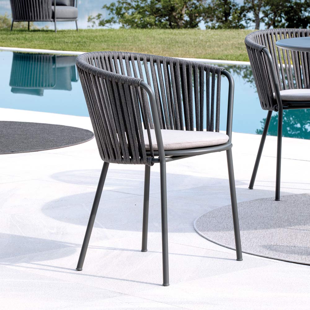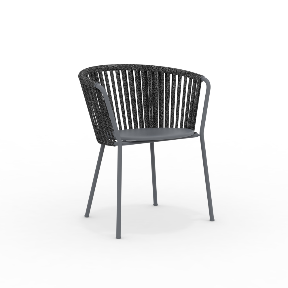 De roestvrijstalen structuur garandeert stevigheid en weerstand tegen weersinvloeden, terwijl het touwvlechtwerk een vleugje lichtheid en verfijning geeft en de zitting omhult met een comfortabele omhelzing. Het ergonomische ontwerp en de ronde lijnen zorgen voor een aangename en ontspannende zitervaring.