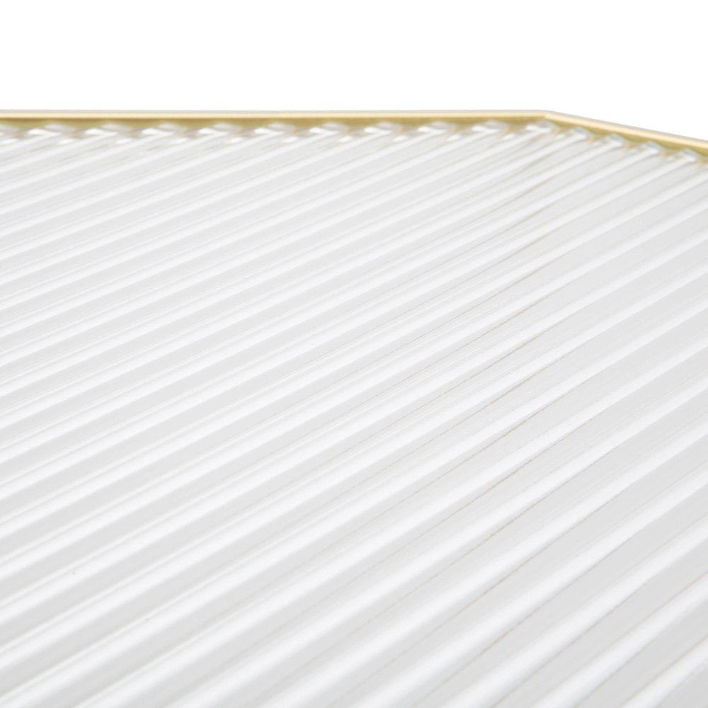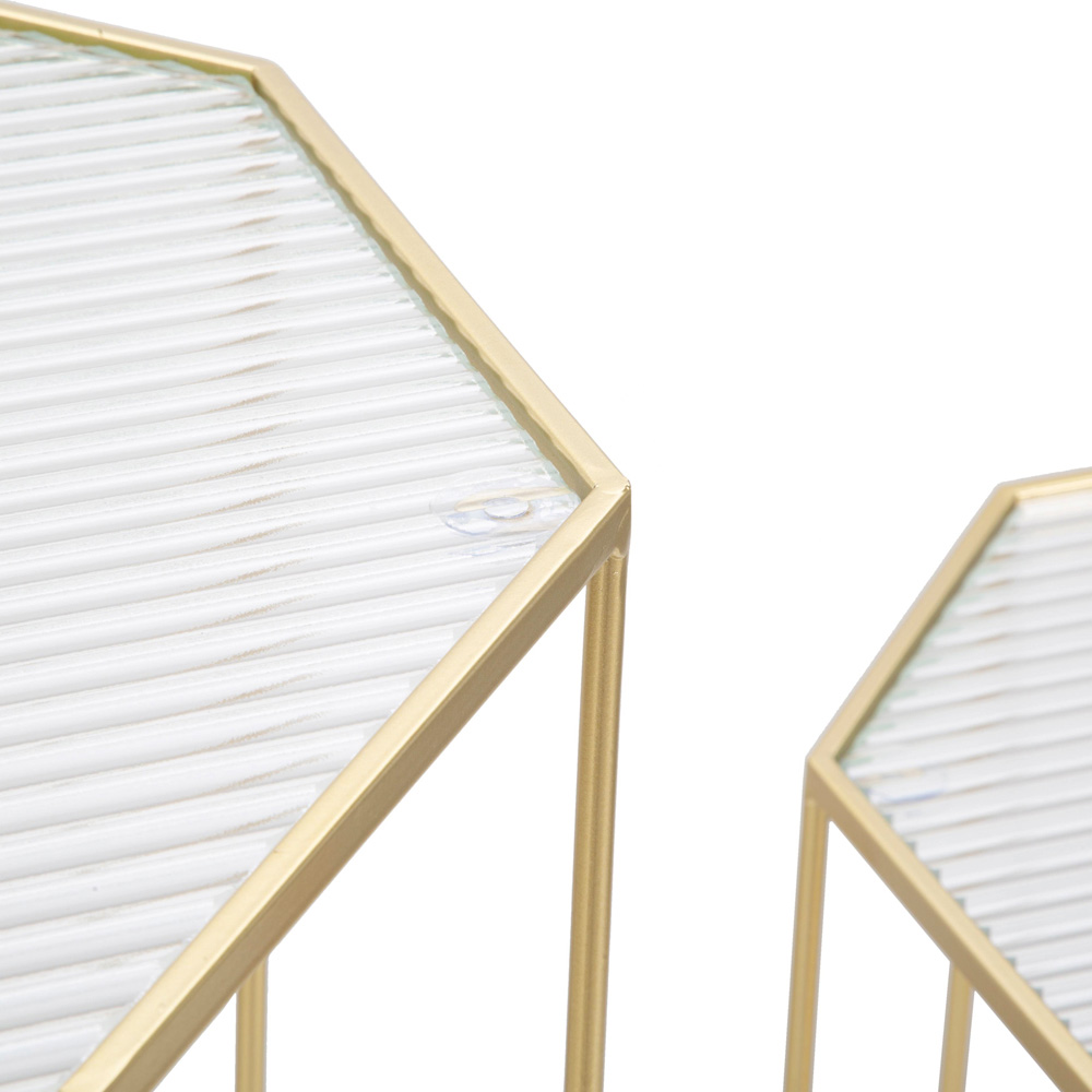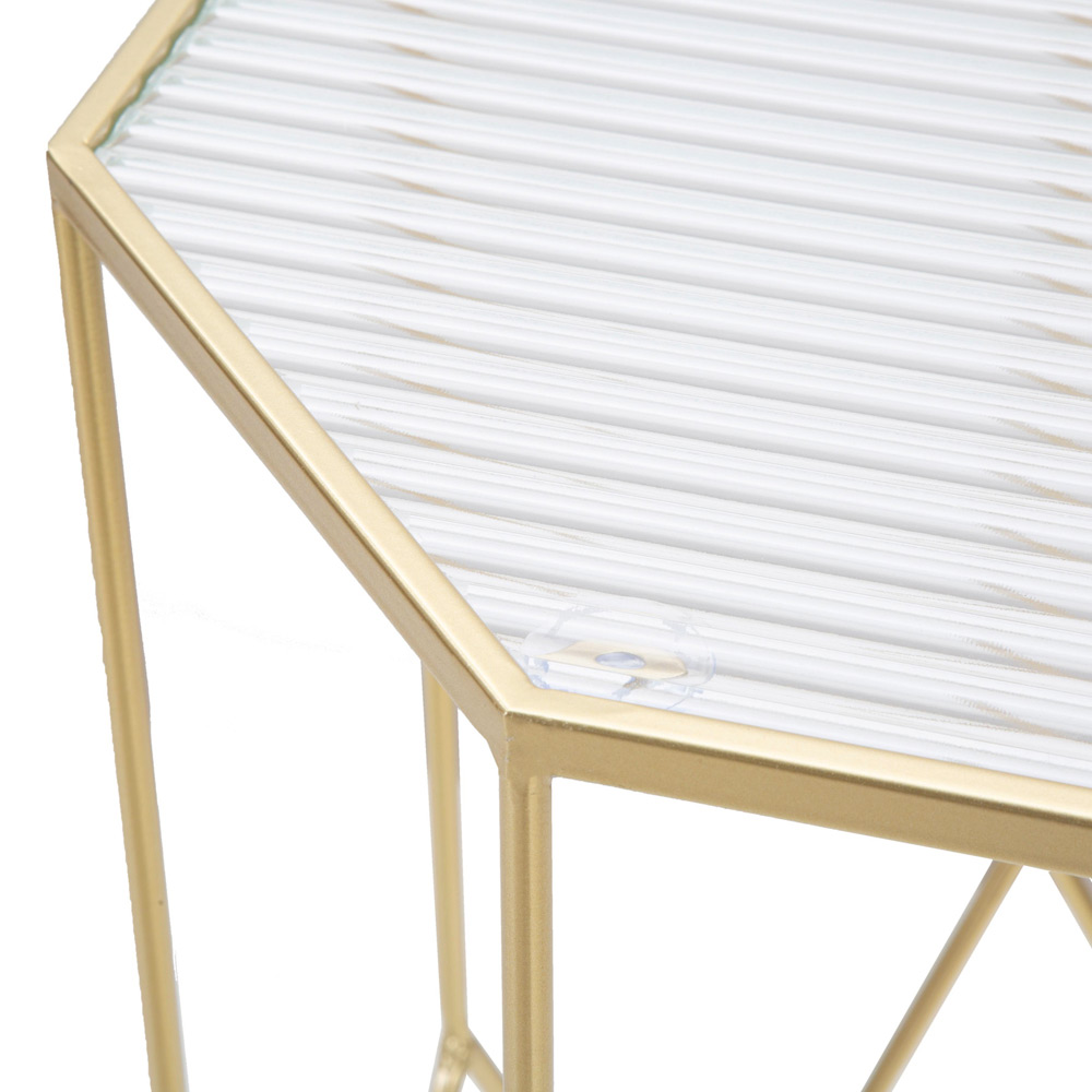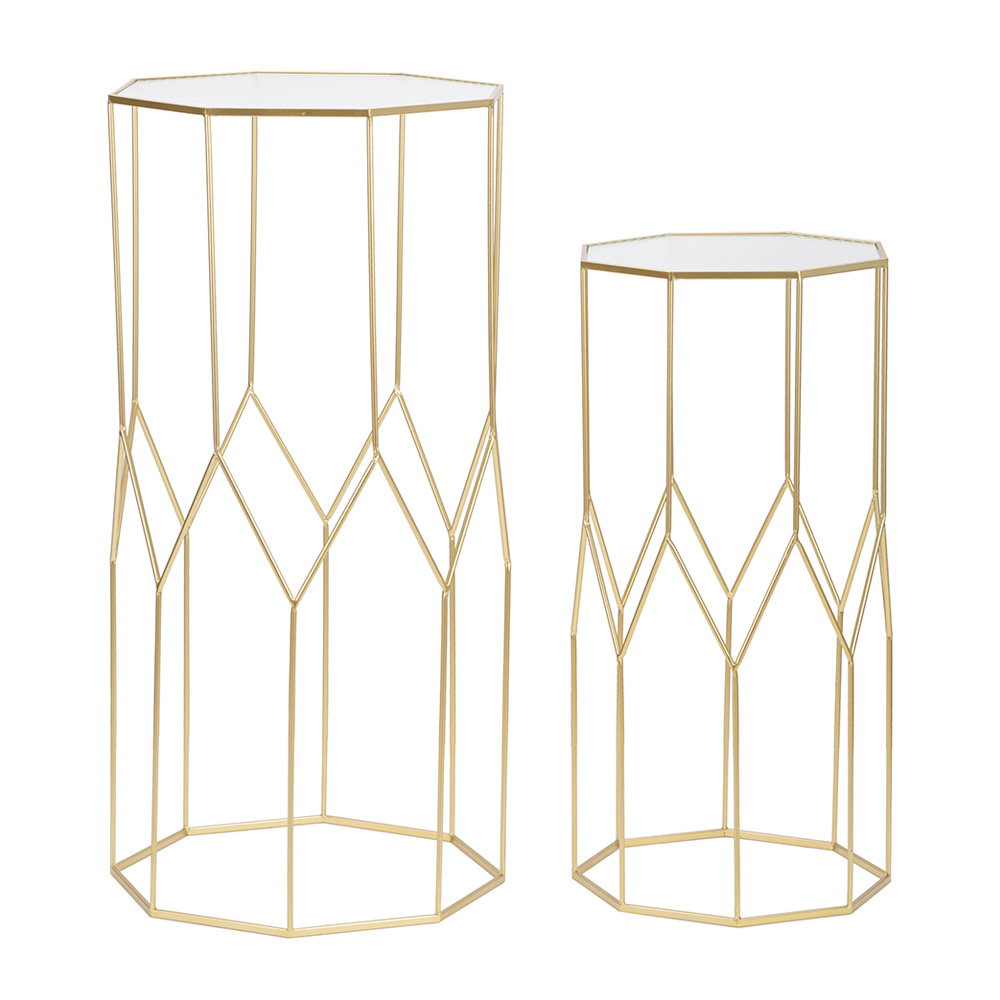 2 Gouden ijzeren telefoontafels met geometrische lijnen die een gevoel van diepte creëren, compleet met fijn bewerkt glazen blad.