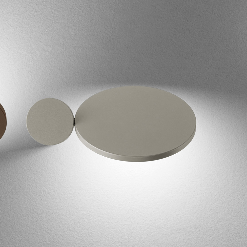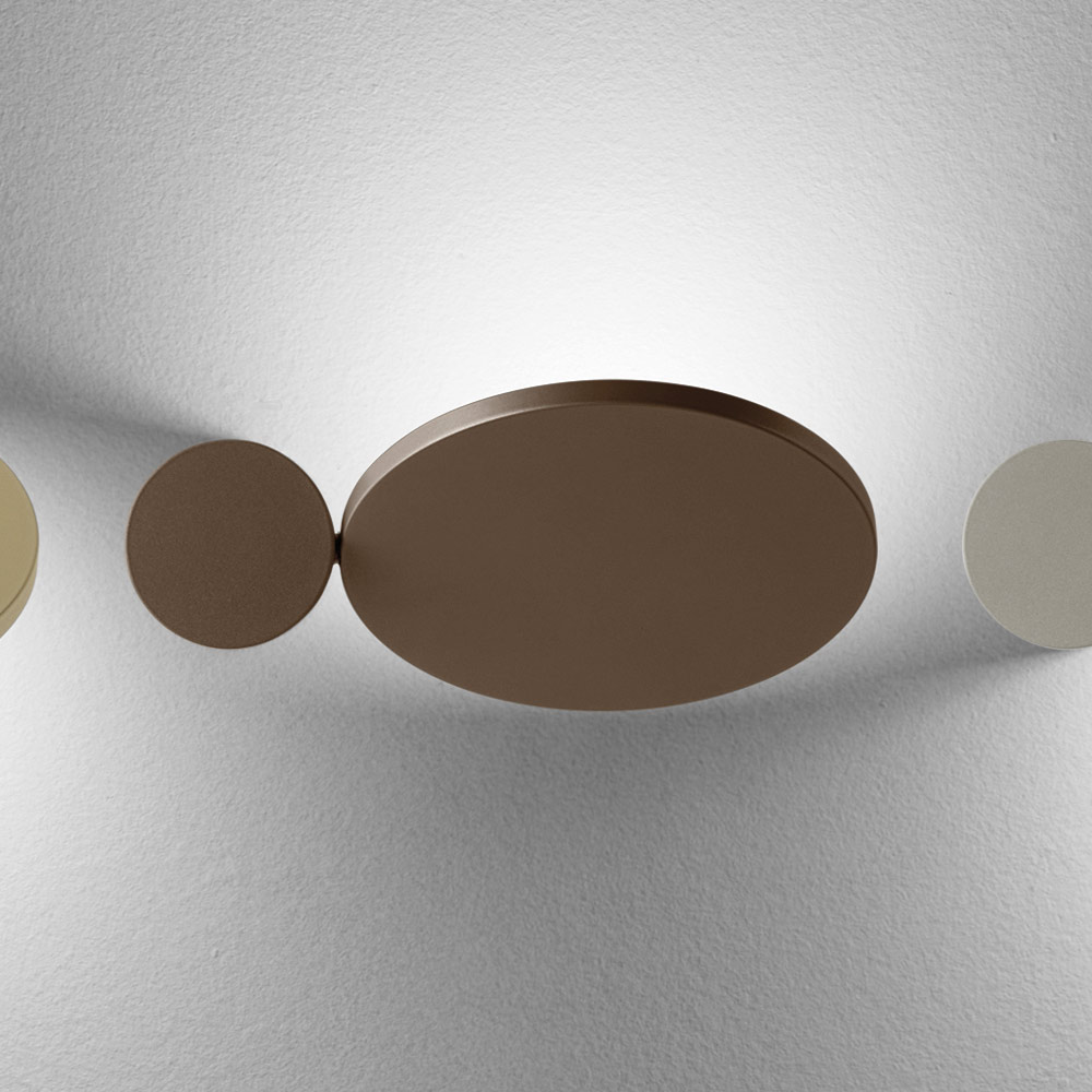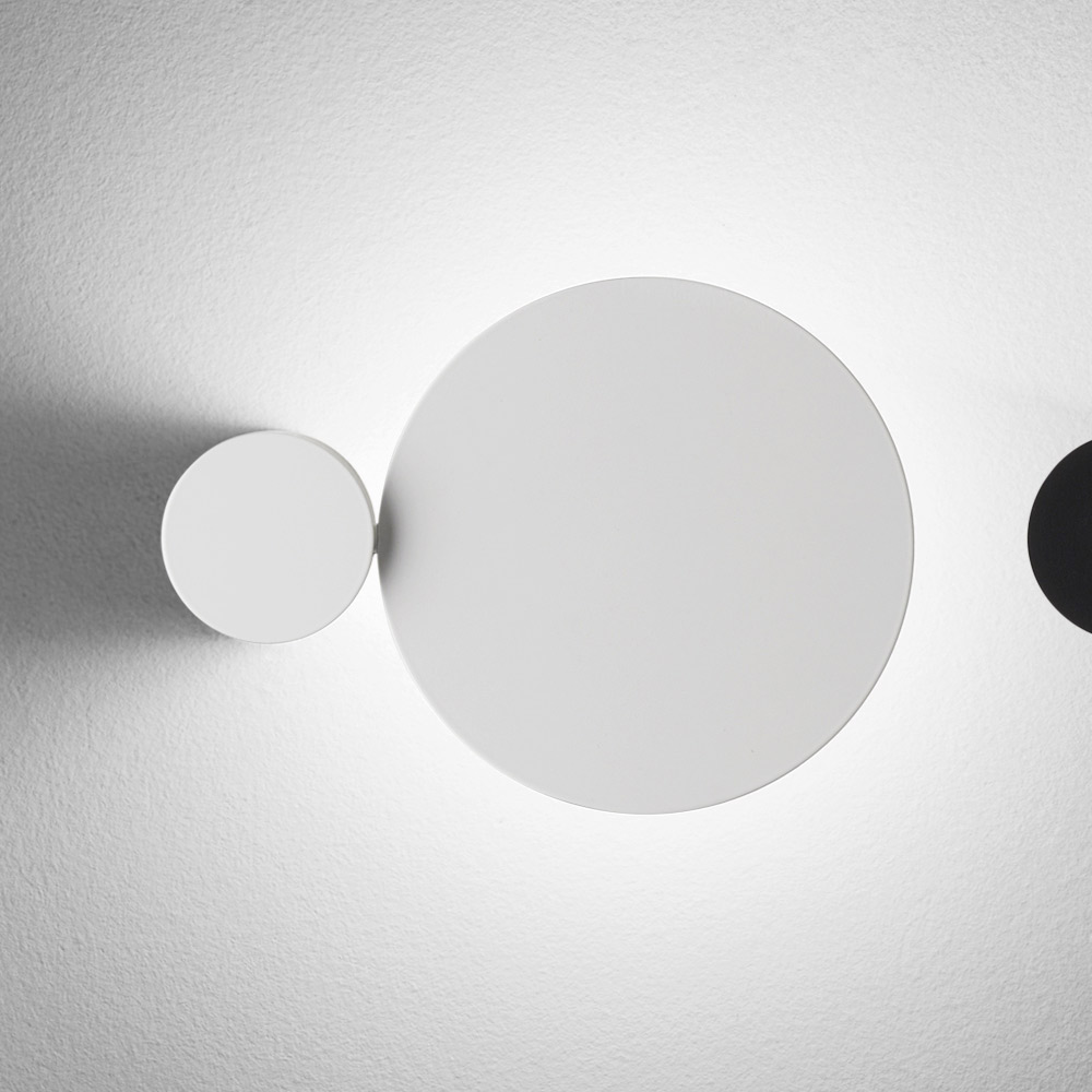 Deze wandlamp is een waar lichtgevend kunstwerk , dat grafisch design en decoratieve functionaliteit in één hand combineert. Hij is opgebouwd uit essentiële geometrische vormen en speelt met overlappende schijven en ovalen die, wanneer ingeschakeld, een zacht en dramatisch lichteffect op de muur creëren.