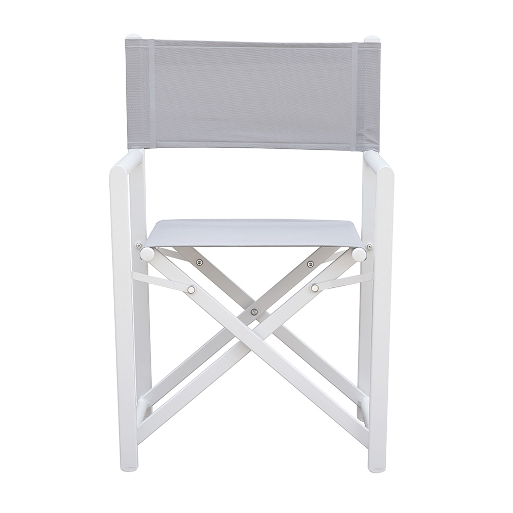 Geef een vleugje elegantie en functionaliteit aan uw buitenruimte met deze tuin regisseursstoel. Zijn lichte maar stevige wit aluminium frame biedt een onberispelijke weerstand tegen weersinvloeden, perfect voor uw patio, terras of tuin.