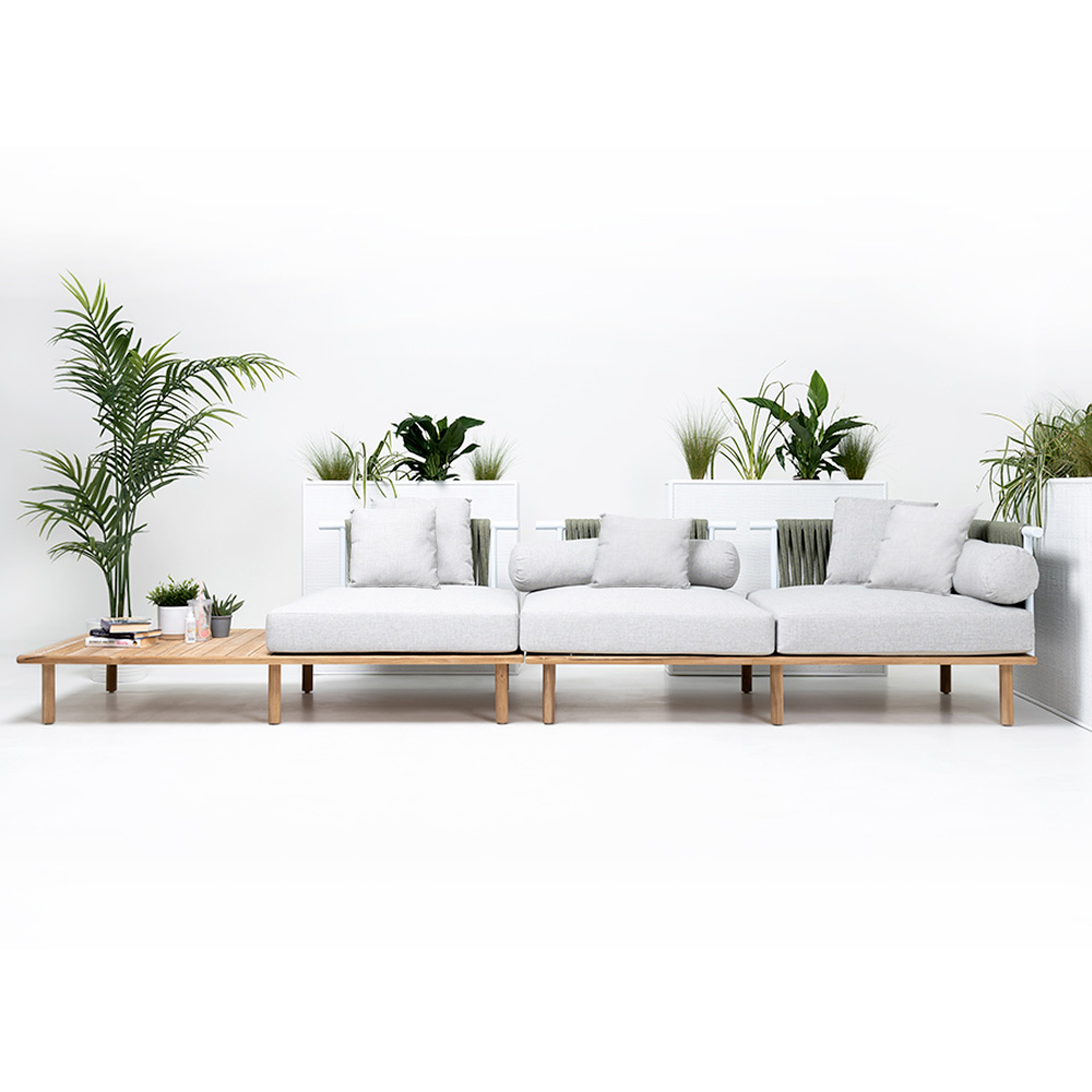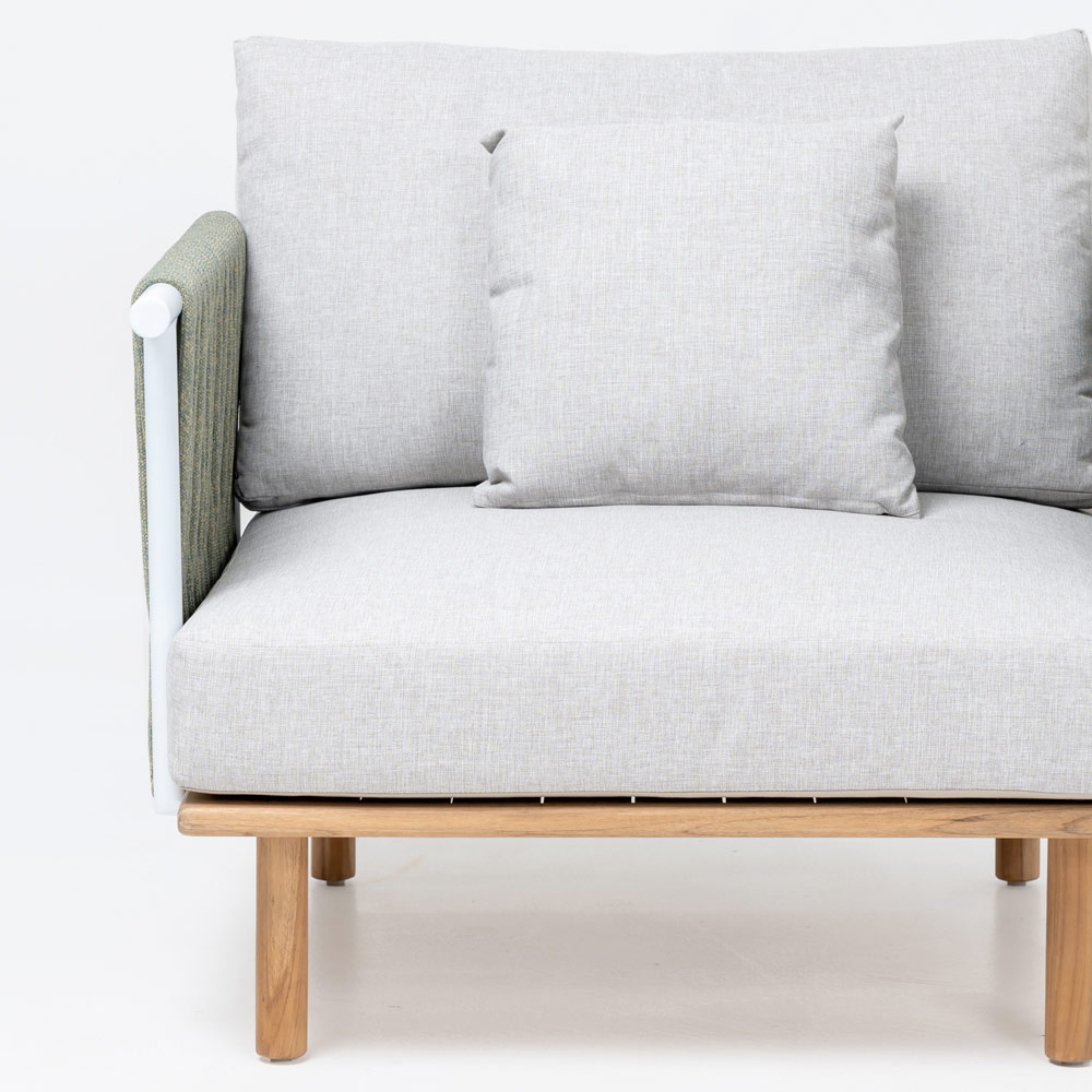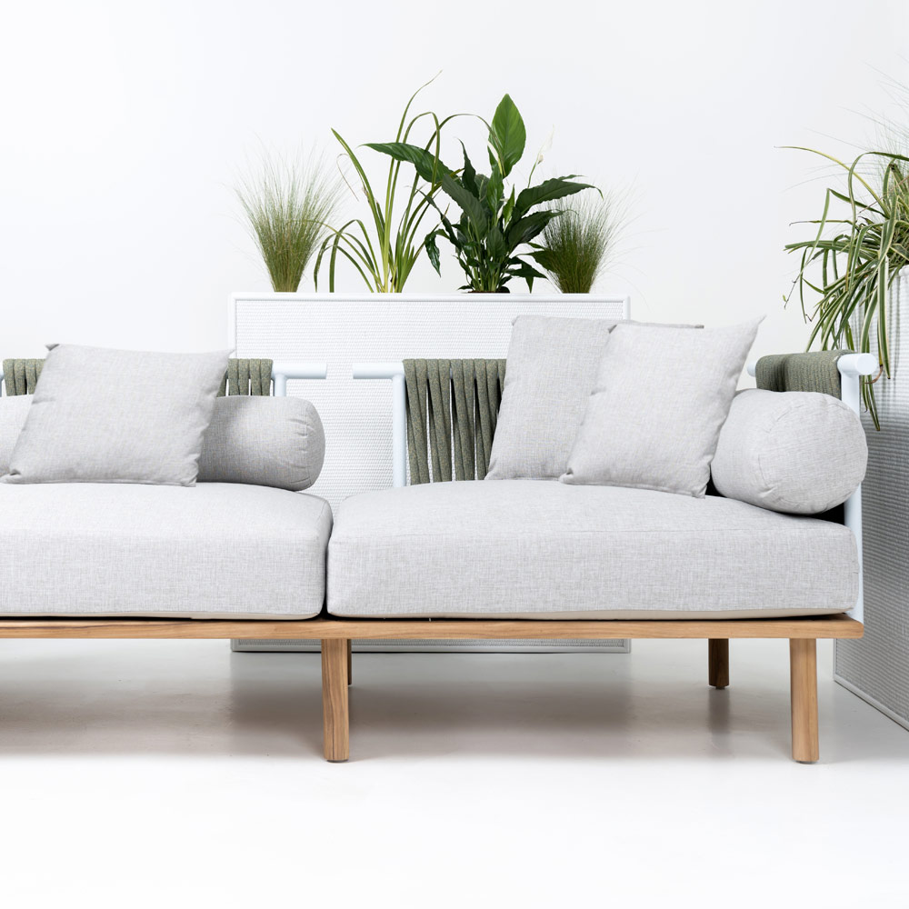 Modulaire tuinbank in teakhout, aluminium rugleuningen en weefwerk in Olefin/PP ROPE en kussens