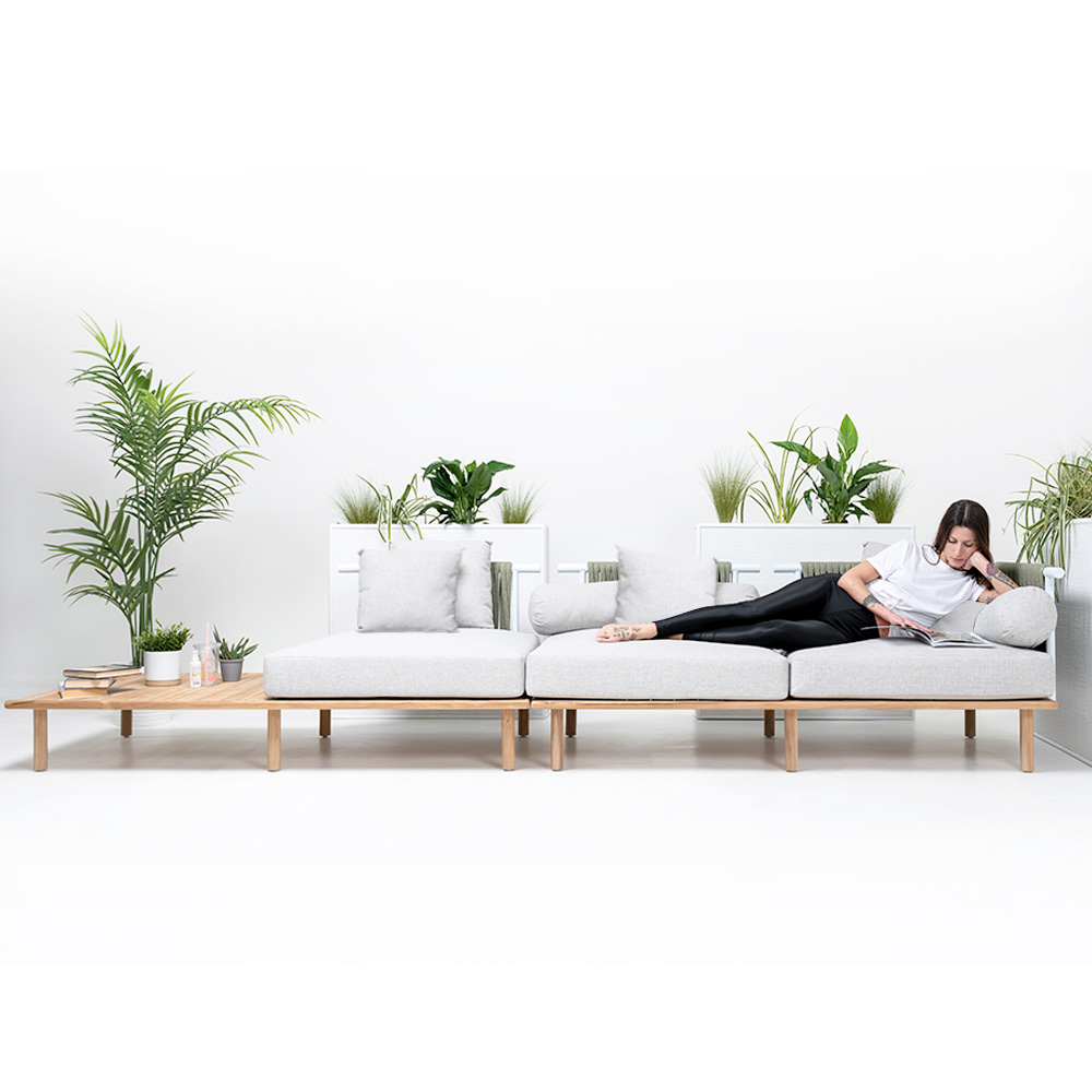 NB: 4 zitkussens, 2 rugleuningkussens 80x50 cm, 2 kussens 40x40 cm en 2 rollen 70xdiam.15 cm zijn inbegrepen. De kussens hebben allemaal een lichtgrijze afwerking, maar kunnen worden aangepast.