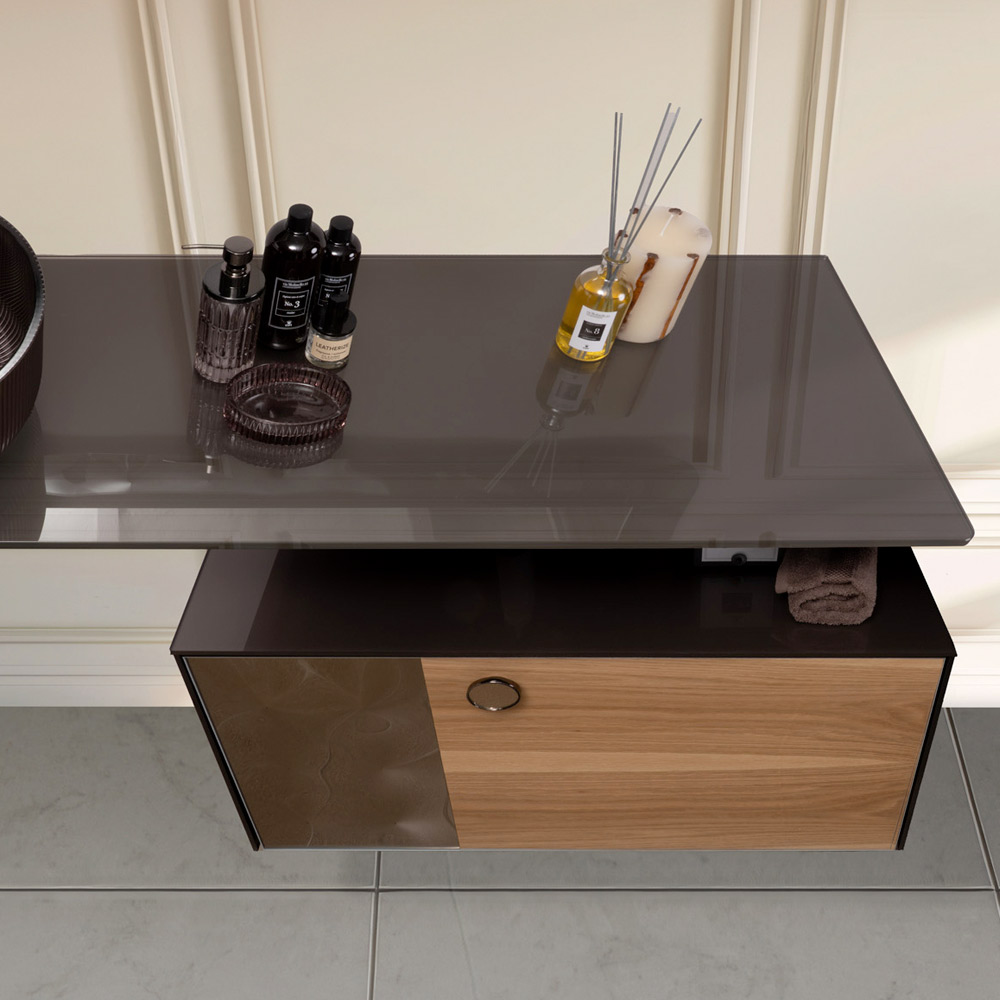Het centrale deel van natuurlijk hout met zichtbare nerfstructuur combineert harmonieus met de bovenkant en zijkanten van 8 mm extra helder gehard gekleurd glas . De zijkanten van de lade zijn van gebogen glas , wat zich kenmerkt door een driedimensionaal effect met lichtgevende reflecties, waardoor het ontwerp wordt verrijkt met een onderscheidend en verfijnd detail.