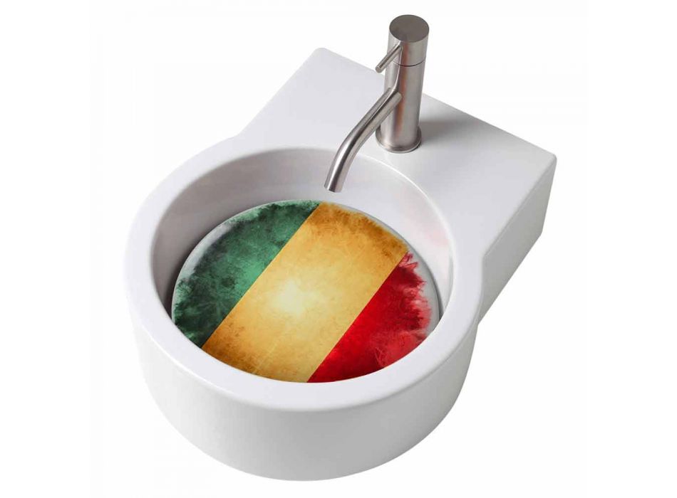 Rond design aanrecht / hangende wastafel gemaakt in Italië Tor Handwas met continu stromend water, zijdelings aan de verwijderbare plaat. Hangende of vrijstaande installatie. De verwijderbare plaat is verkrijgbaar in verschillende afwerkingen: - Wit; - met de vlag van Brazilië; - met de vlag van Canada; - met de vlag van Zwitserland; - met de vlag van Duitsland; - met de vlag van Frankrijk; - met de vlag van Italië; - met de vlag van Noorwegen; - met de vlag van Zweden; - met de vlag van het Verenigd Koninkrijk; - met de vlag van de Verenigde Staten van Amerika.