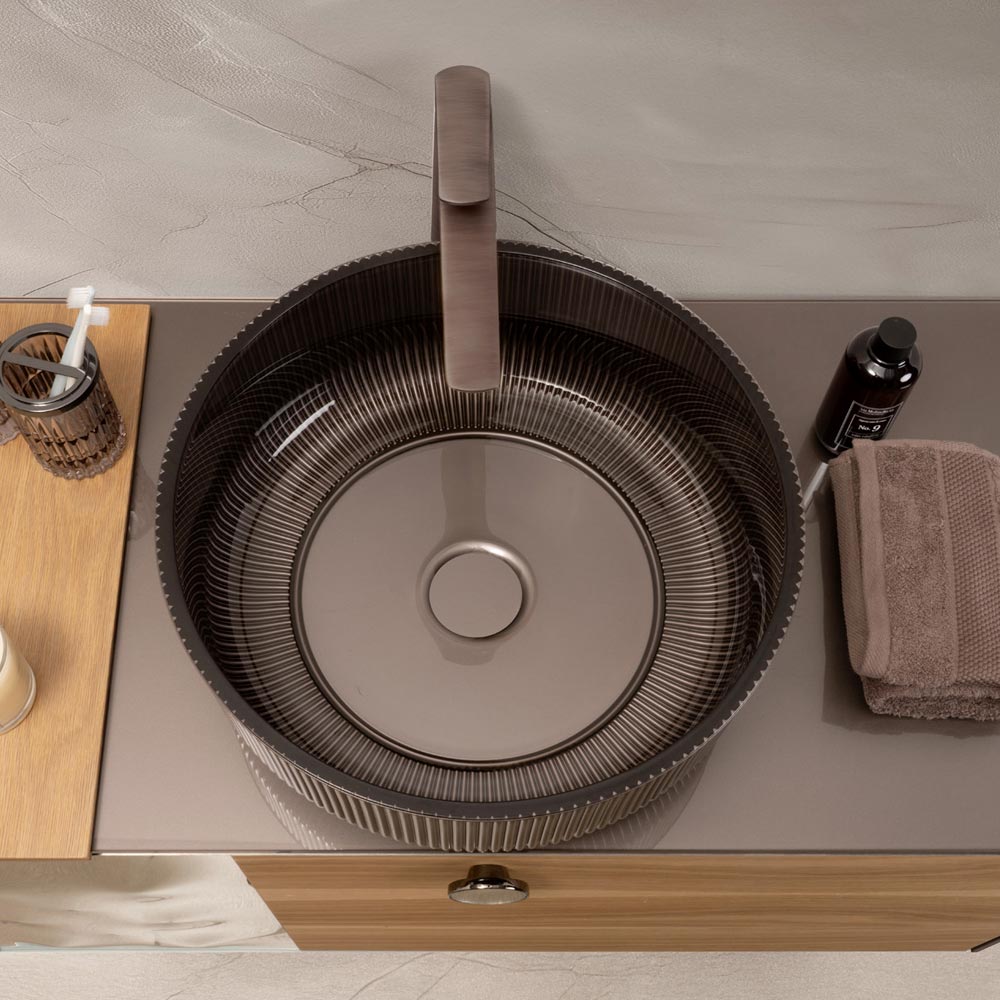 Verkrijgbaar in verfijnde kleuren , past de wastafel in zowel klassieke als moderne interieurs en geeft altijd een exclusief en verfijnd karakter. De tinten, gecombineerd met de natuurlijke helderheid van het glas, zorgen voor diepte en beweging, waardoor de wastafel een waar decoratief kunstwerk wordt.