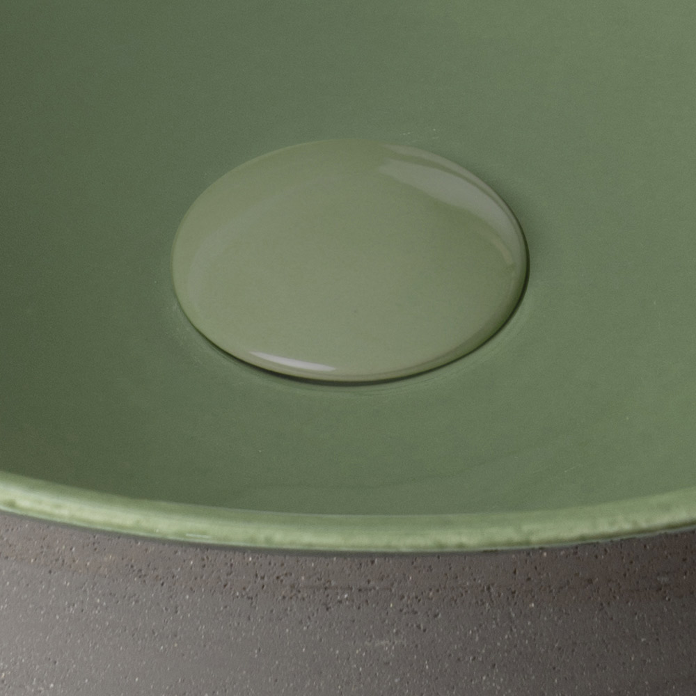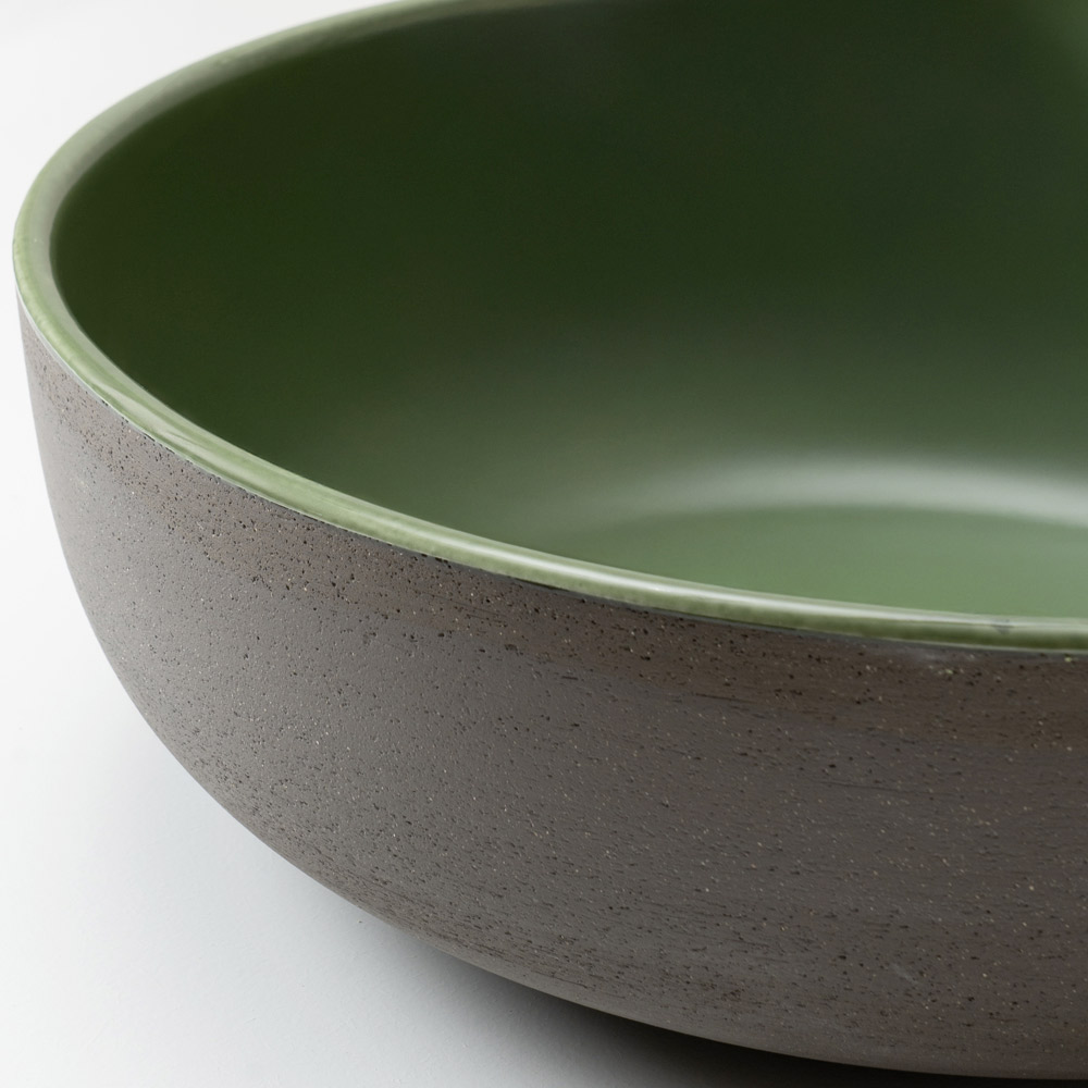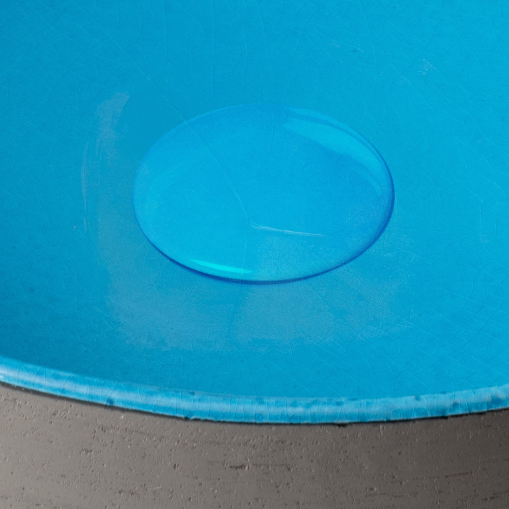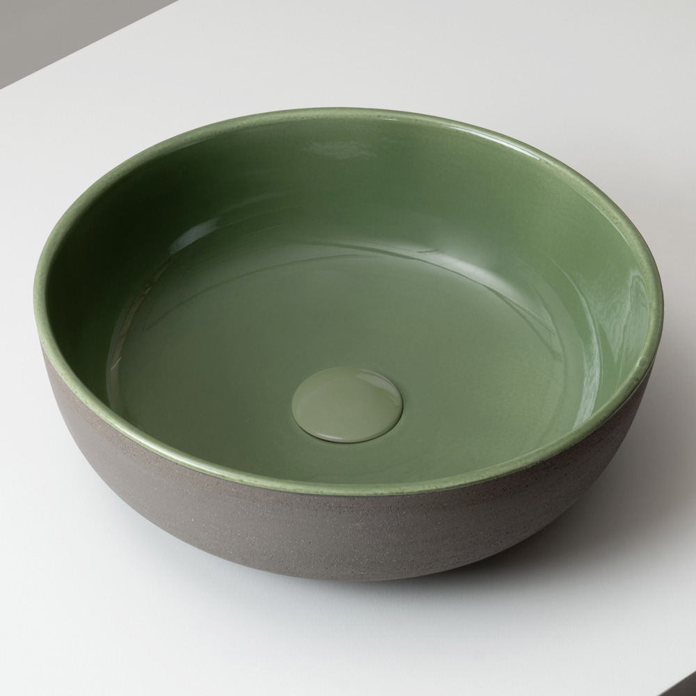 Deze opbouwspoelbak heeft een donkere Raku-afwerking aan de buitenkant en valt op door zijn uitlopende vorm en het contrast tussen het emaille aan de binnenkant en het bijna geschuurde oppervlak aan de buitenkant. Deze balans tussen de materialen maakt de spoelbak tot een waar designstatement.