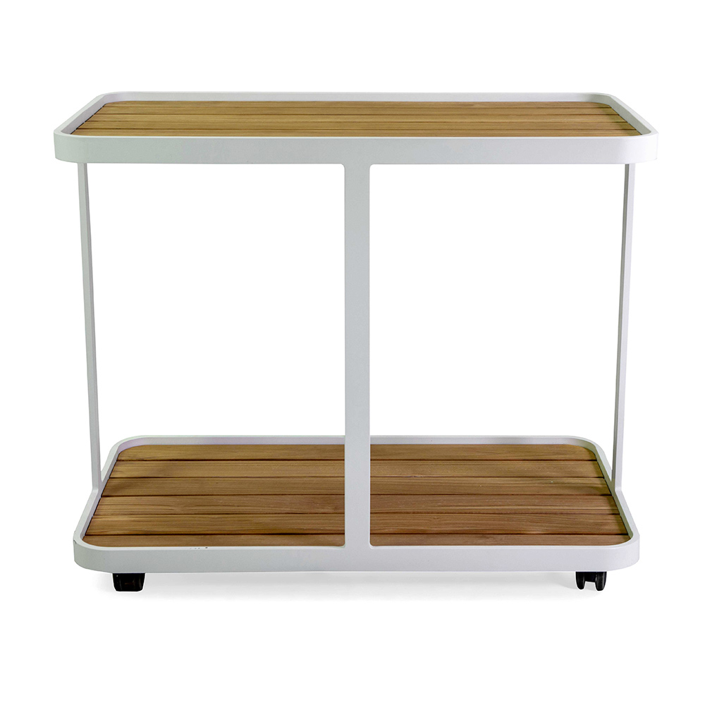 Deze elegante poedercoated aluminium trolley is ideaal voor het brengen van een vleugje verfijning en functionaliteit in uw buitenruimte. Het moderne, minimalistische ontwerp wordt aangevuld door teakhout bladen, bekend om hun sterkte en duurzaamheid, waardoor deze trolley perfect is voor zowel binnen- als buitengebruik. De onderste plank biedt extra ruimte voor serviesgoed of decoraties, waardoor het een essentieel accessoire is voor elke gelegenheid om buiten te entertainen of te ontspannen.