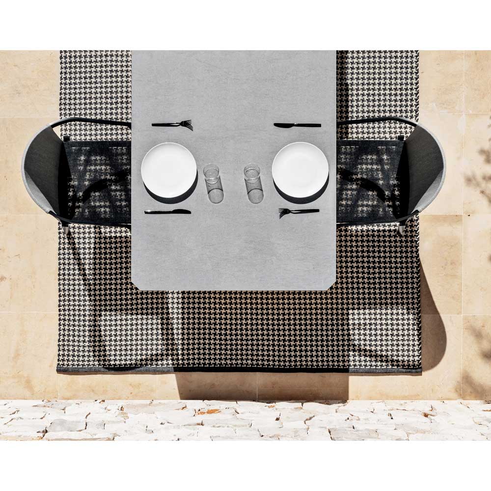 De collectie wordt gekenmerkt door het detail van de aluminium poot als middelpunt gecombineerd met de formele en modulaire strengheid van de vulling, om het buitenleven te ervaren in termen van maximale ontspanning en gezelligheid, zittend op de bank, rond een tafel of liggend op de zonnebank.