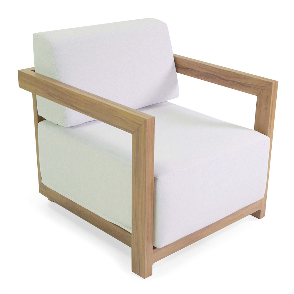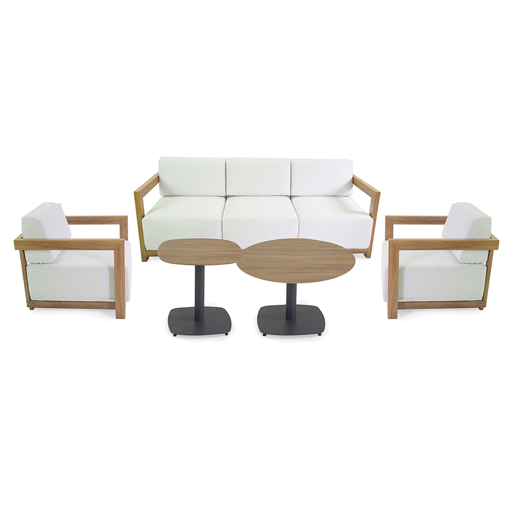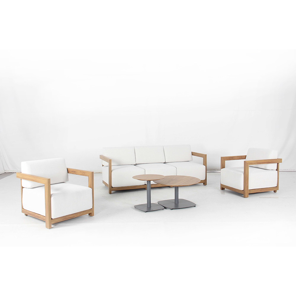 Deze lounge set is de belichaming van hedendaagse elegantie, perfect voor het creëren van een gastvrije en verfijnde sfeer in elke buitenruimte. Elk stuk combineert strakke lijnen en materialen van hoge kwaliteit, met een stevig houten frame en gezellige kussens in weerbestendige stof, die zorgen voor langdurig comfort en minimaal onderhoud.