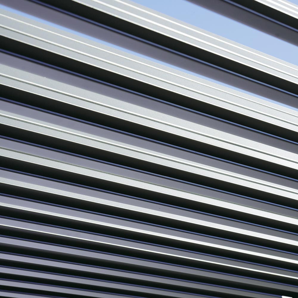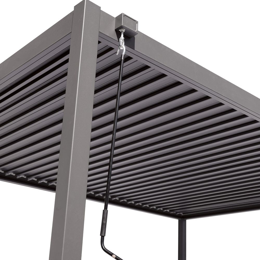 De aluminium steunpalen van 90 x 90 mm en de dakdwarsliggers van 120 x 30 mm / 147 x 30 mm zorgen voor een solide en betrouwbare constructie. Het verstelbare lamellendak , bediend via een externe stalen slinger , maakt het mogelijk om de lichtinval en ventilatie eenvoudig te regelen en zo op elk moment van de dag de ideale omgeving te creëren.
