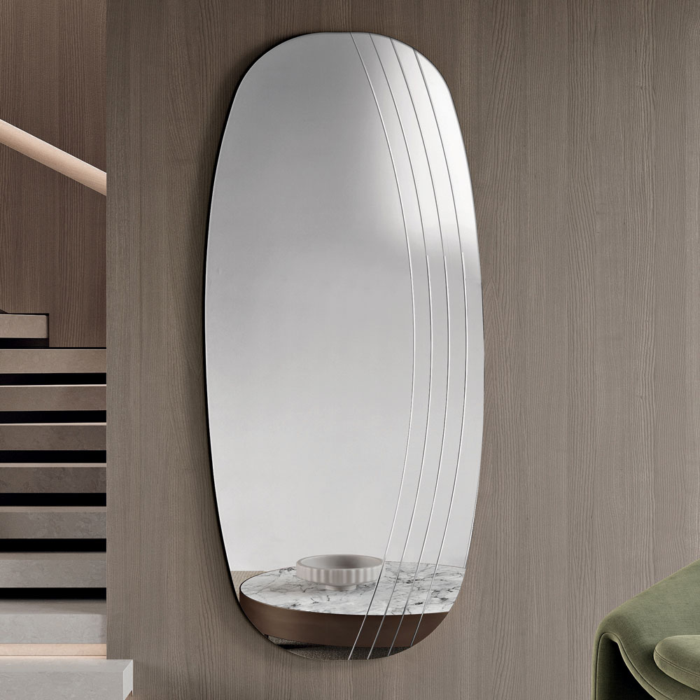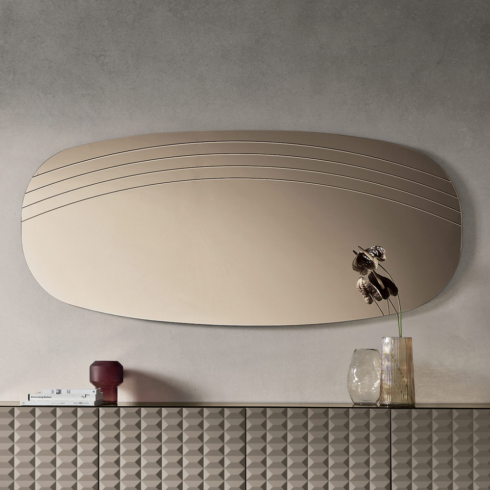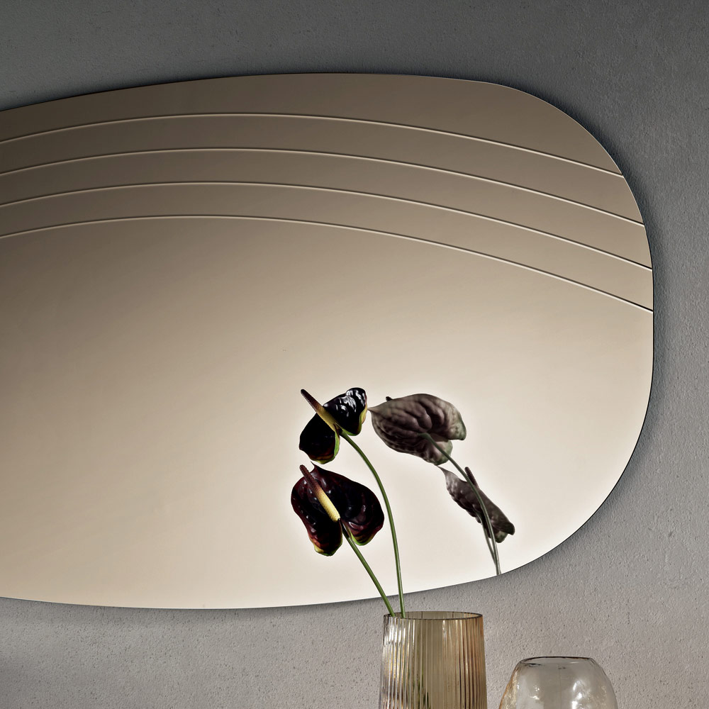 Het reflecterende oppervlak wordt versterkt door subtiele, zijdelingse inkepingen die de golvende contouren van de spiegel volgen, waardoor een verfijnd samenspel van licht en textuur ontstaat. Dit decoratieve detail voegt visuele diepte toe en benadrukt de harmonie van de vormen, waardoor de spiegel een verfijnde en moderne uitstraling krijgt.
