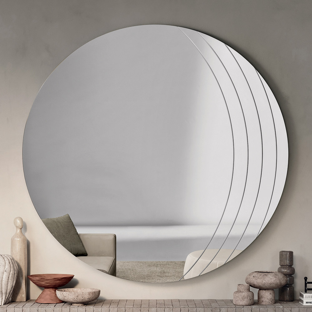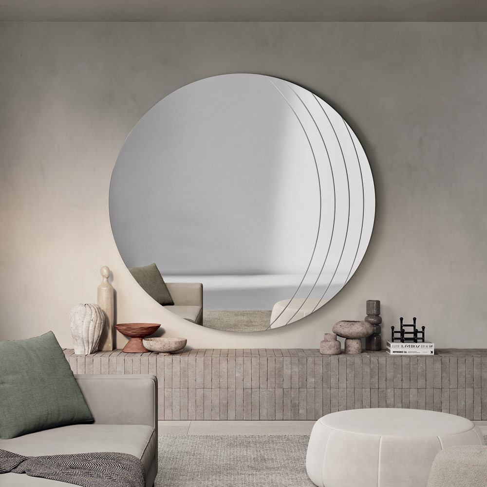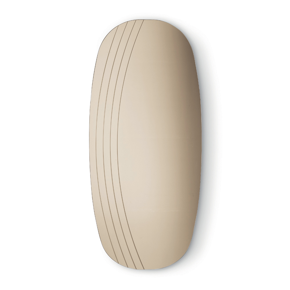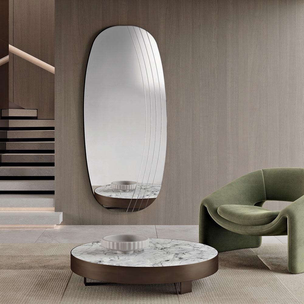 Het reflecterende oppervlak wordt versterkt door subtiele, zijdelingse inkepingen die de golvende contouren van de spiegel volgen, waardoor een verfijnd samenspel van licht en textuur ontstaat. Dit decoratieve detail voegt visuele diepte toe en benadrukt de harmonie van de vormen, waardoor de spiegel een verfijnde en moderne uitstraling krijgt.