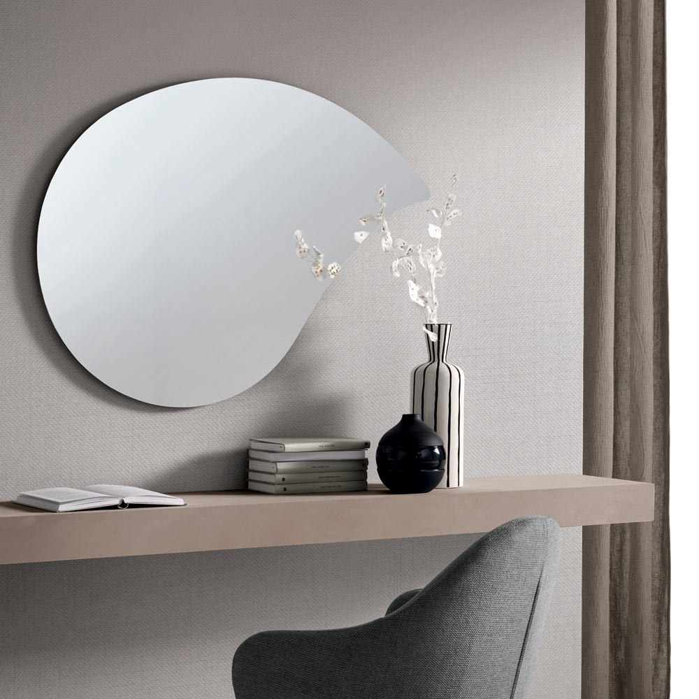 De spiegel kan afzonderlijk als iconisch object worden gebruikt of in combinatie met andere spiegels om dynamische composities op de muur te creëren, waardoor hij een waar grafisch element wordt dat de ruimte vormgeeft met balans en beweging.