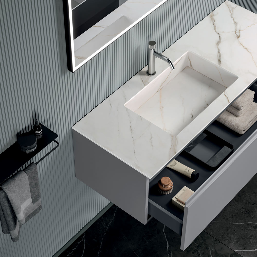 De compositie straalt eigentijdse elegantie uit met strakke lijnen, zwevende volumes en hoogwaardige materialen. Een badkamermeubel ontworpen voor verfijnde ruimtes, waar design en dagelijkse functionaliteit samenkomen.
