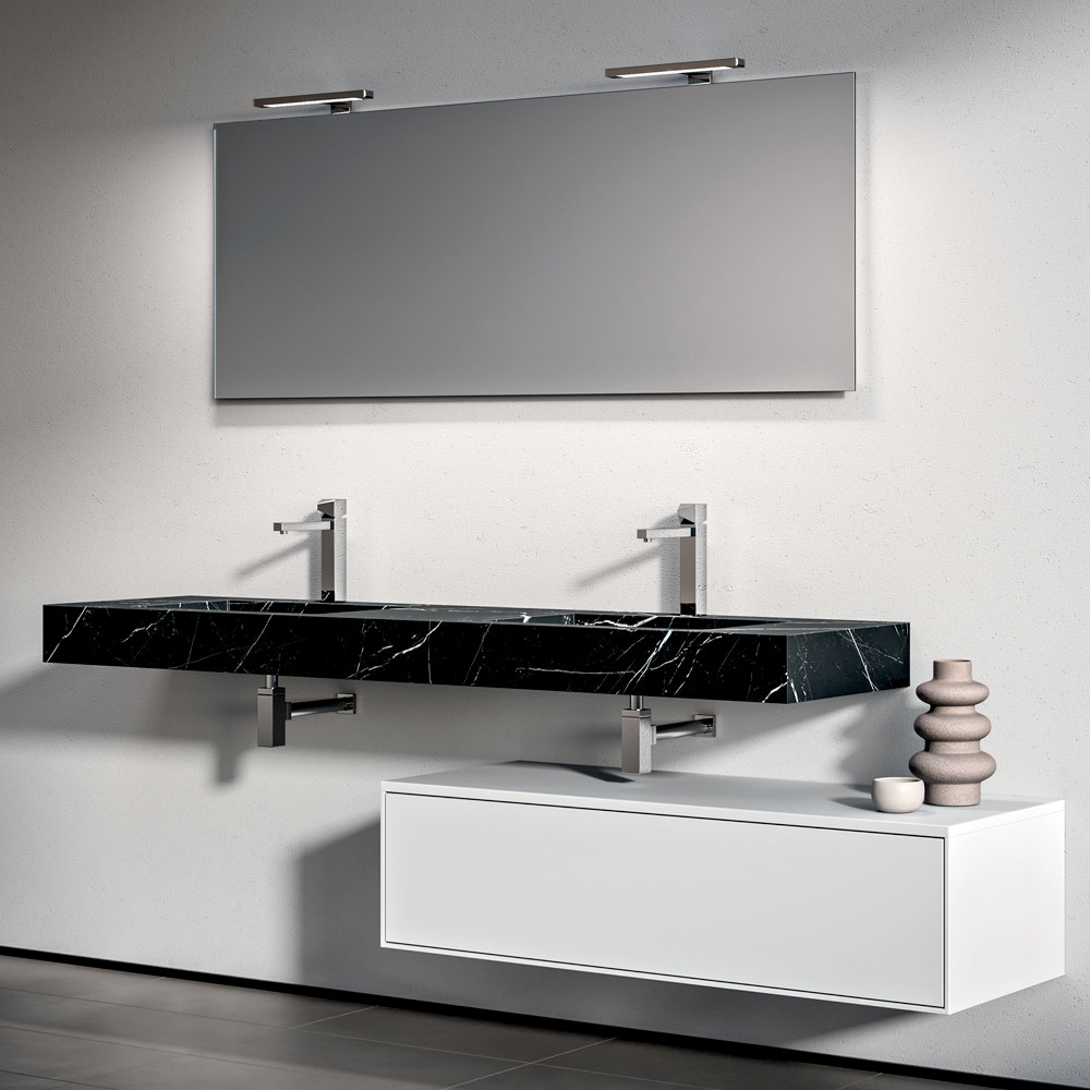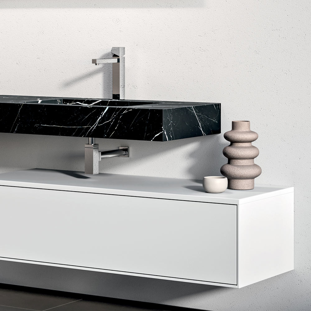 Een dramatische en eigentijdse badkamercompositie, ontworpen voor grote, stijlvolle ruimtes. Het dubbele wastafelblad van HPL met Marquina-effect voegt karakter en visuele diepte toe en creëert een verfijnd contrast met de matwitte basis.