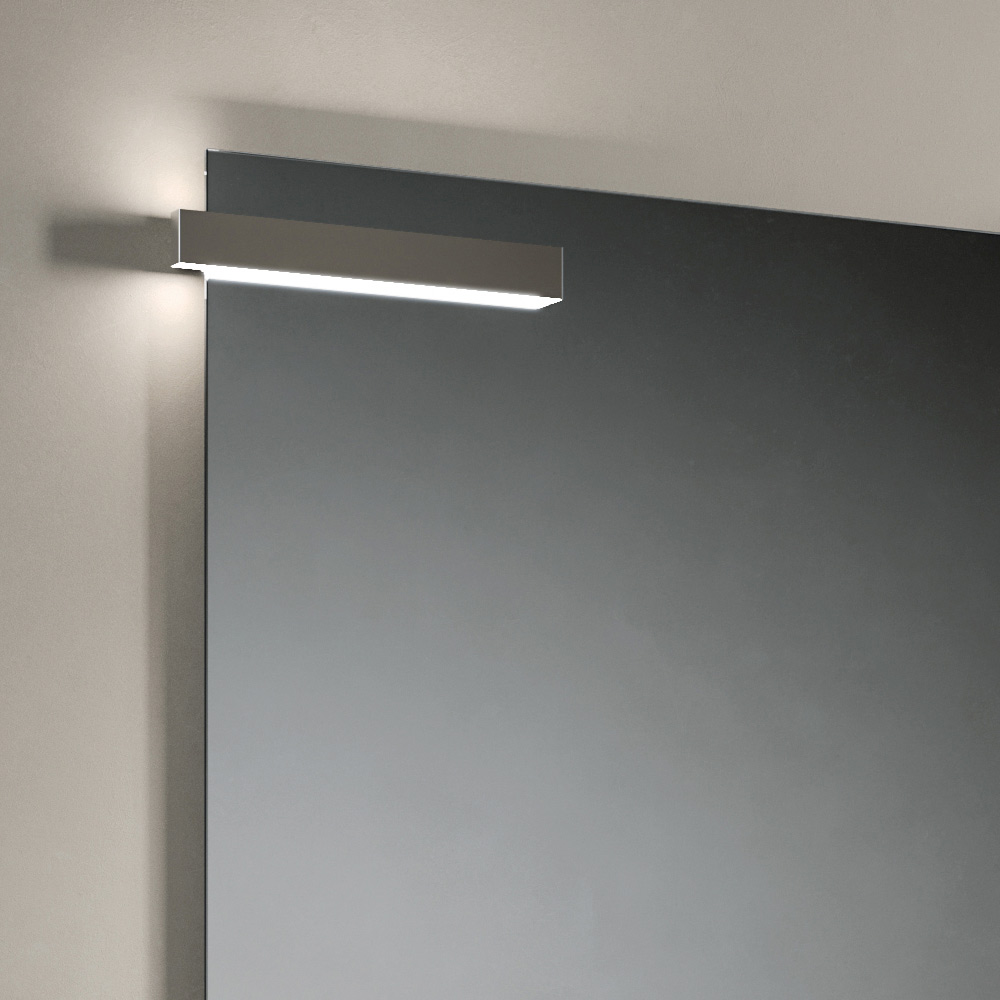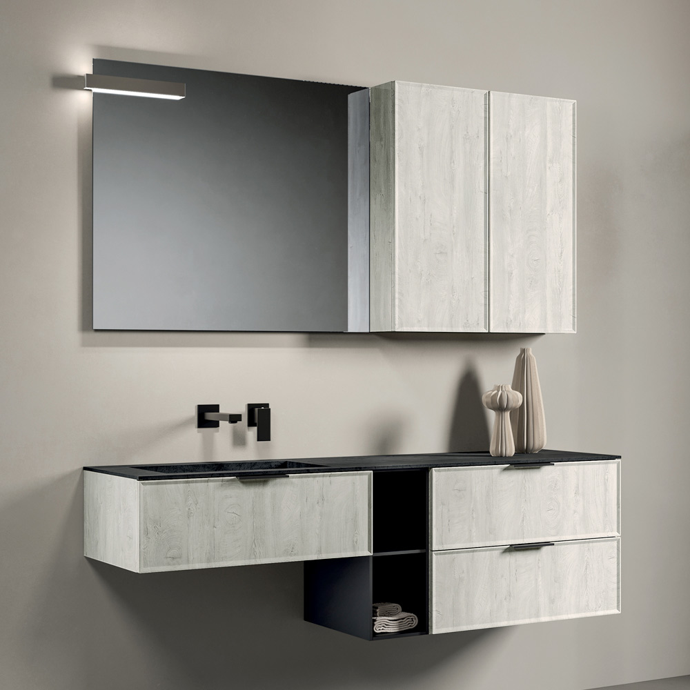 De compositie wordt ge completeerd door de rechthoekige spiegel en de ledlamp , die zorgen voor functionele en sfeervolle verlichting, ideaal om de wastafel te accentueren en het visuele comfort te verhogen.