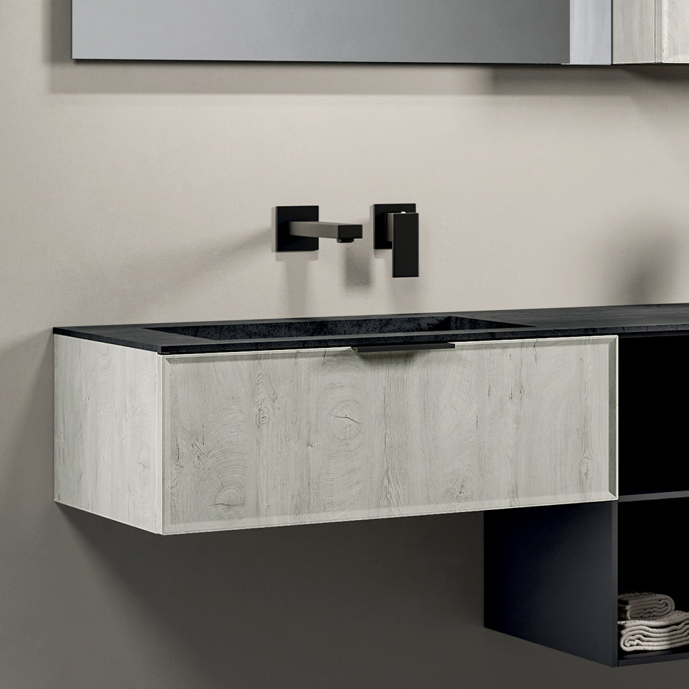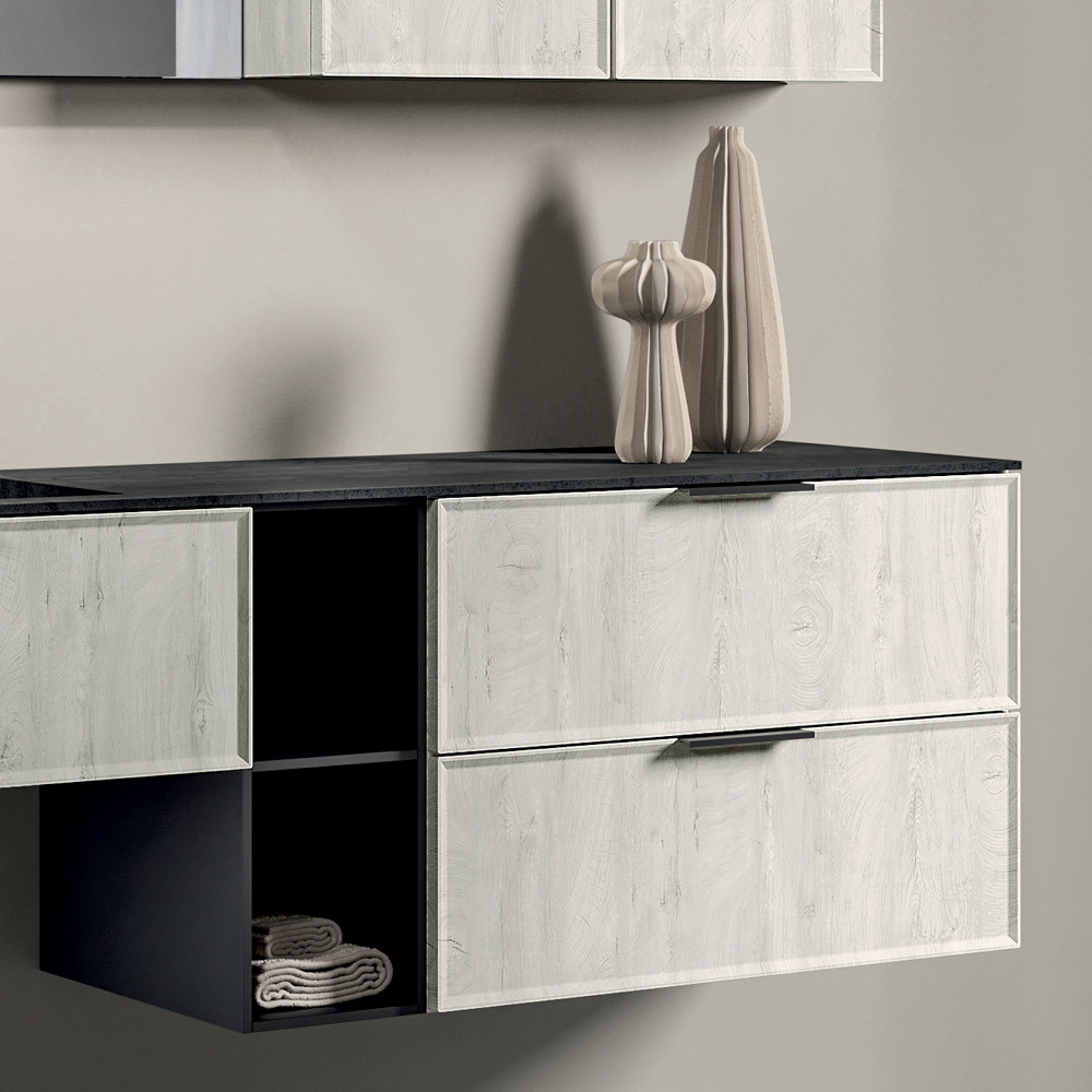 De compositie combineert een grote en ruime basis met lades (de eerste lade is gesloten), ontworpen voor orde en dagelijkse functionaliteit, geflankeerd door 2 wandelementen die de opbergruimte uitbreiden met behoud van een lichte en evenwichtige uitstraling.