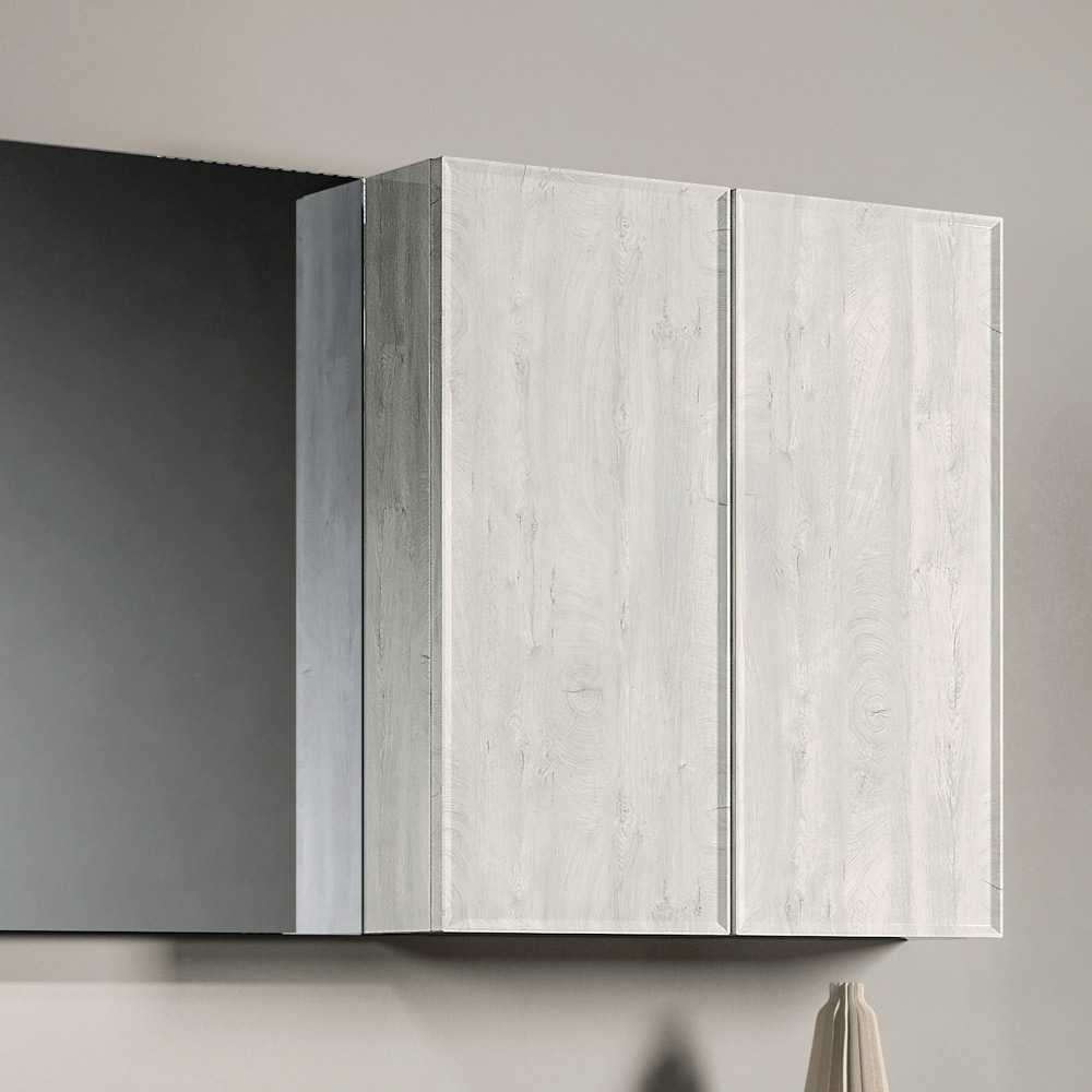 Het hangende badkamerkastje van Alaska-eikenhout valt op door zijn lichte, natuurlijke afwerking, die de ruimte optisch vergroot en perfect past in een eigentijdse, minimalistische omgeving.