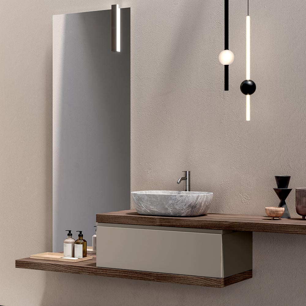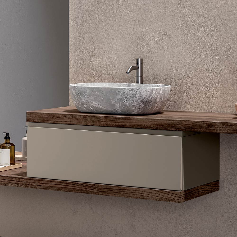 Een complete badkameroplossing, ontworpen voor wie een modern, hangend badkamermeubel wenst, gekenmerkt door warme afwerkingen, subtiele contrasten en een sterke esthetische identiteit.