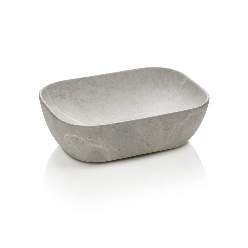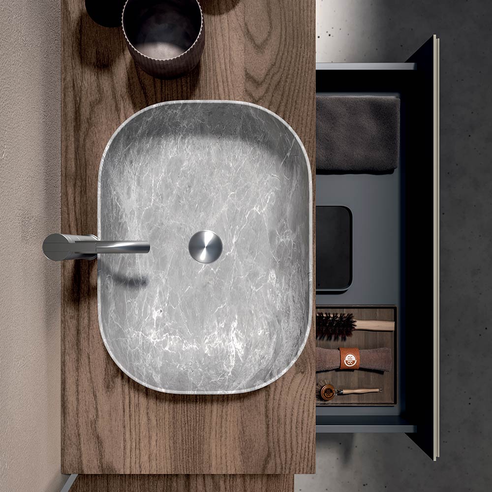 De grijze keramische wastafel voegt een verfijnde, materiële toets toe: compact, functioneel en perfect geïntegreerd in het geheel, combineert hij duurzaamheid en stijl in één element.