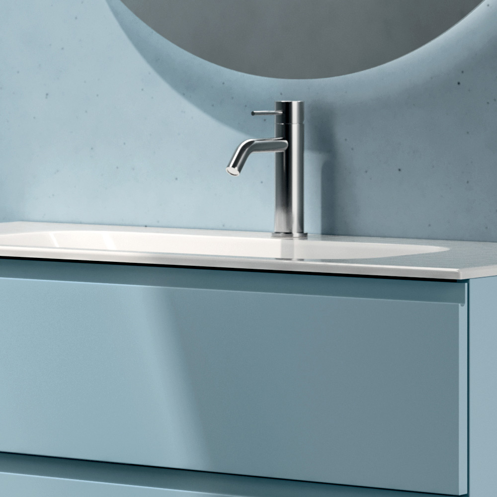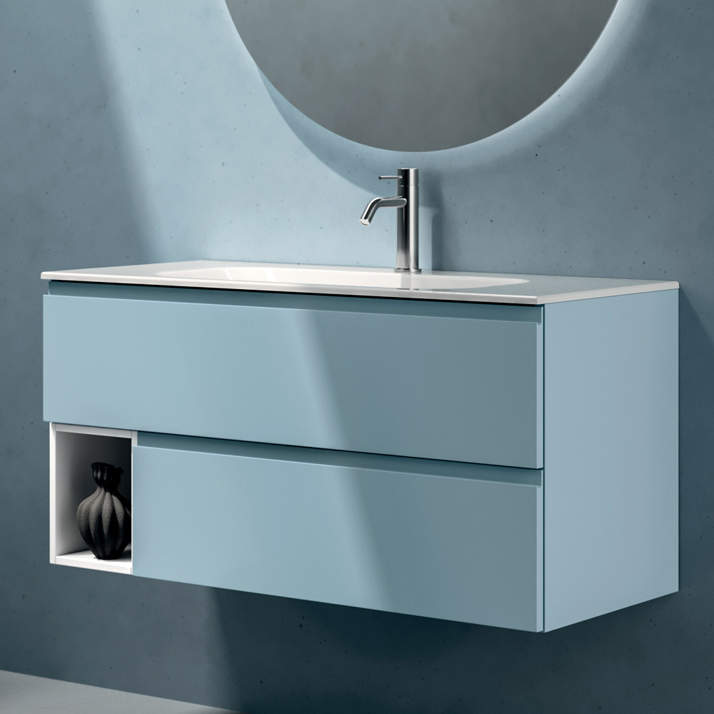 De aan de muur gemonteerde onderkasten met lades in Tiffany-afwerking , waarvan één met een sifonfunctie, zorgen voor een functionele indeling van de opbergruimte en behouden tegelijkertijd een strakke, minimalistische uitstraling. De matte oppervlakken versterken het lineaire ontwerp en dragen bij aan een elegant en harmonieus geheel.