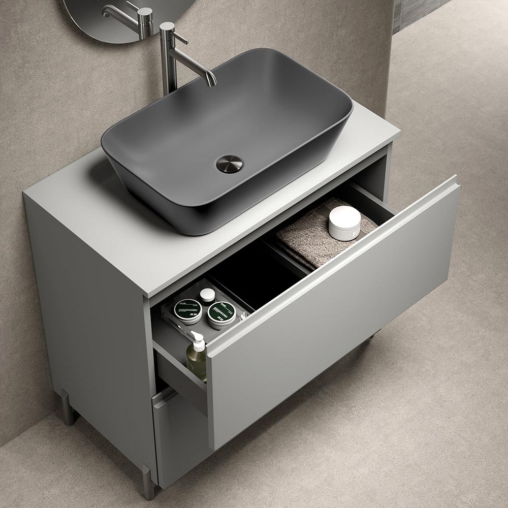 Een oplossing speciaal ontworpen voor wie een modern badkamerkastje op poten zoekt, gekenmerkt door trendy matte afwerkingen en antracietkleurige details met een sterke esthetische uitstraling.