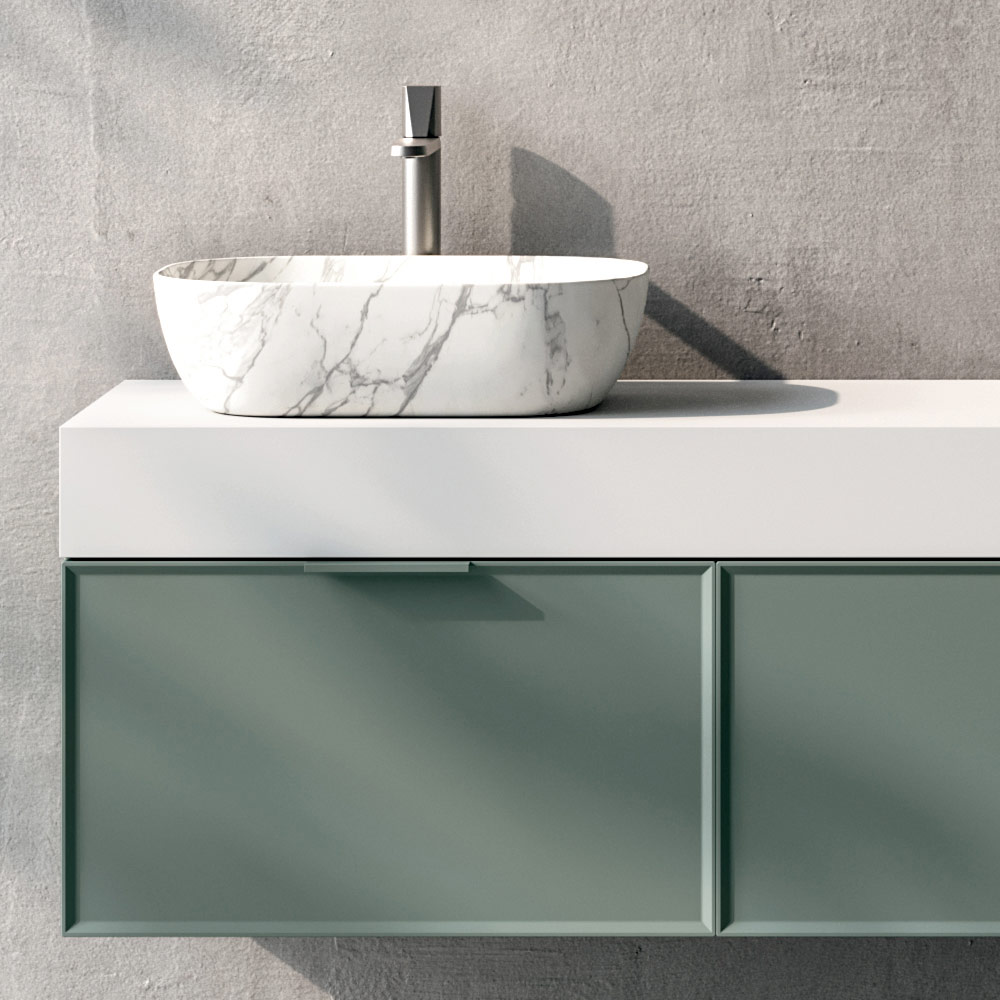 Een elegante, eigentijdse badkamercompositie , ontworpen voor verfijnde, moderne ruimtes. De combinatie van een matte saliegroene afwerking , lichte oppervlakken en heldere details creëert een evenwichtige, ontspannen sfeer met een opvallende esthetiek.