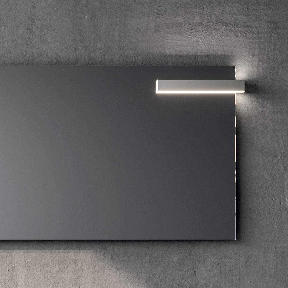 De rechthoekige spiegel met ledverlichting zorgt voor gelijkmatige en functionele verlichting, perfect voor dagelijkse activiteiten, en benadrukt tegelijkertijd de strakke lijnen en de diepte van de ruimte.