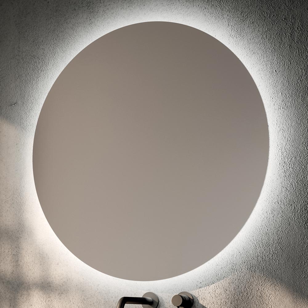 De ronde wastafel van kunsthars , met zijn zachte, minimalistische profiel, integreert perfect met het aanrechtblad, terwijl de verlichte spiegel de helderheid versterkt en de muur visuele diepte geeft, wat bijdraagt aan een ontspannen, moderne sfeer.
