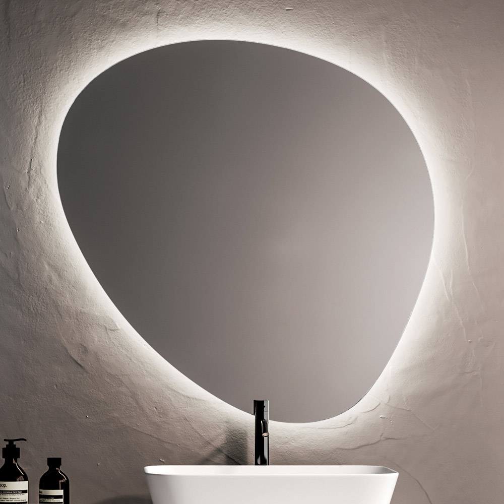 Het middelpunt van de compositie is de gebogen LED-spiegel , die een zacht, omhullend licht langs de rand verspreidt, waardoor de badkamerruimte groter lijkt en een elegante, ontspannen sfeer creëert. De geïntegreerde verlichting verbetert het visuele comfort en accentueert de eigentijdse uitstraling van de ruimte.