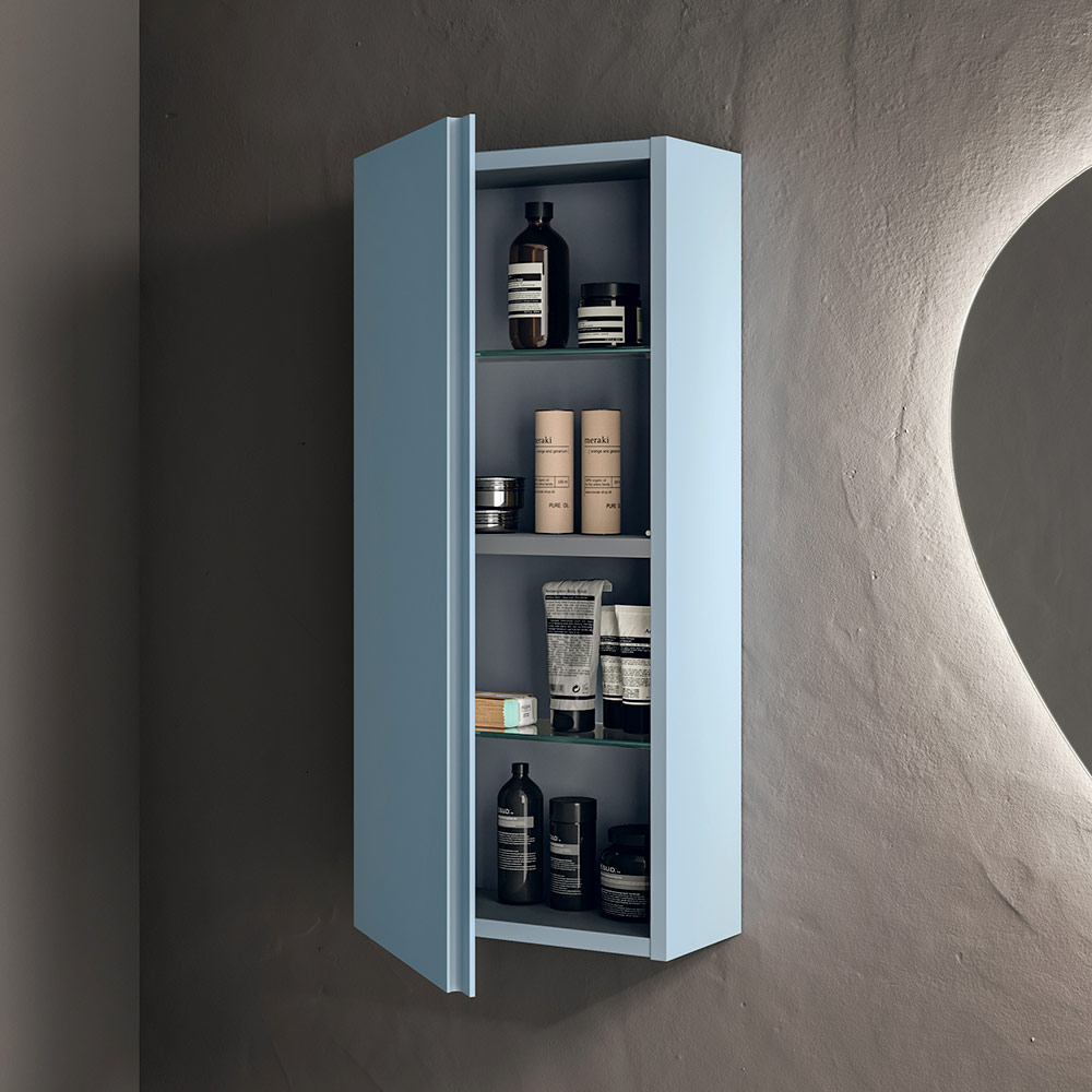 De bijpassende wandkast in Tiffany-kleur completeert het geheel en is ideaal om de opbergruimte uit te breiden zonder het geheel te verzwaren, waardoor een verfijnde en minimalistische esthetische samenhang behouden blijft.