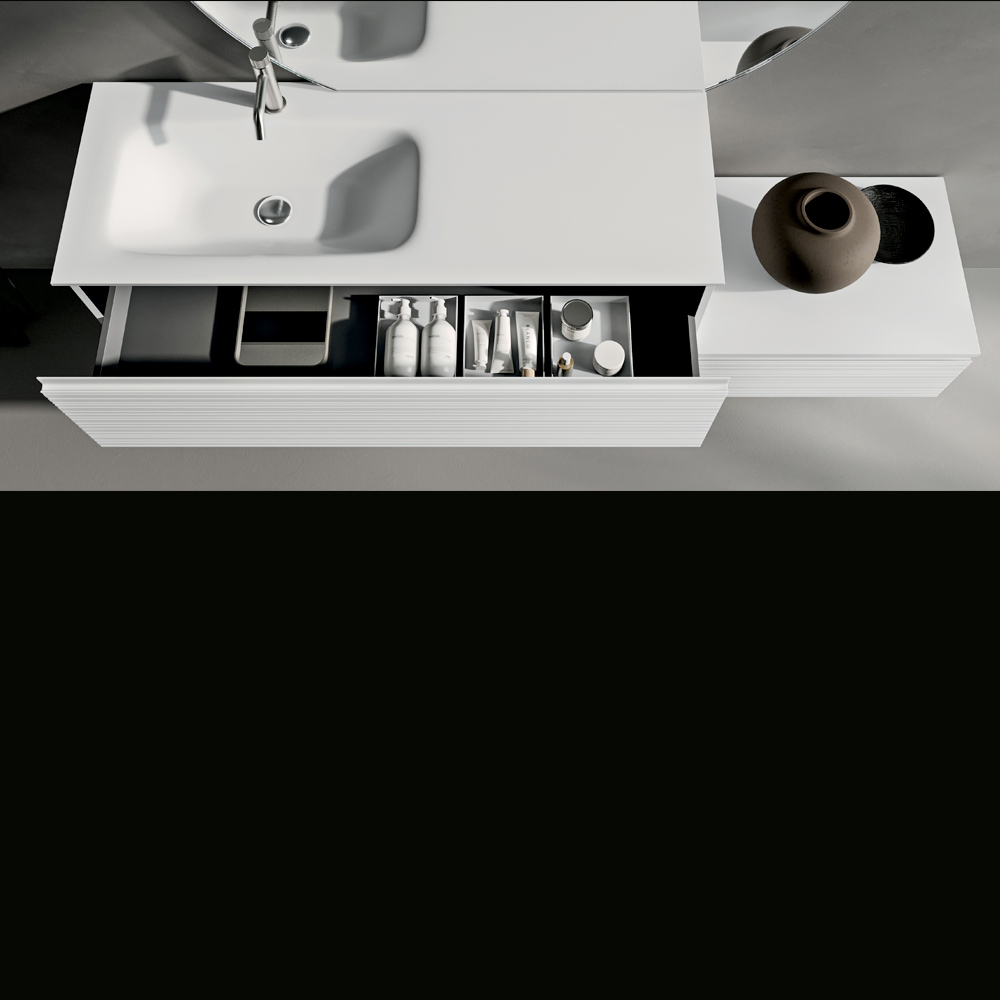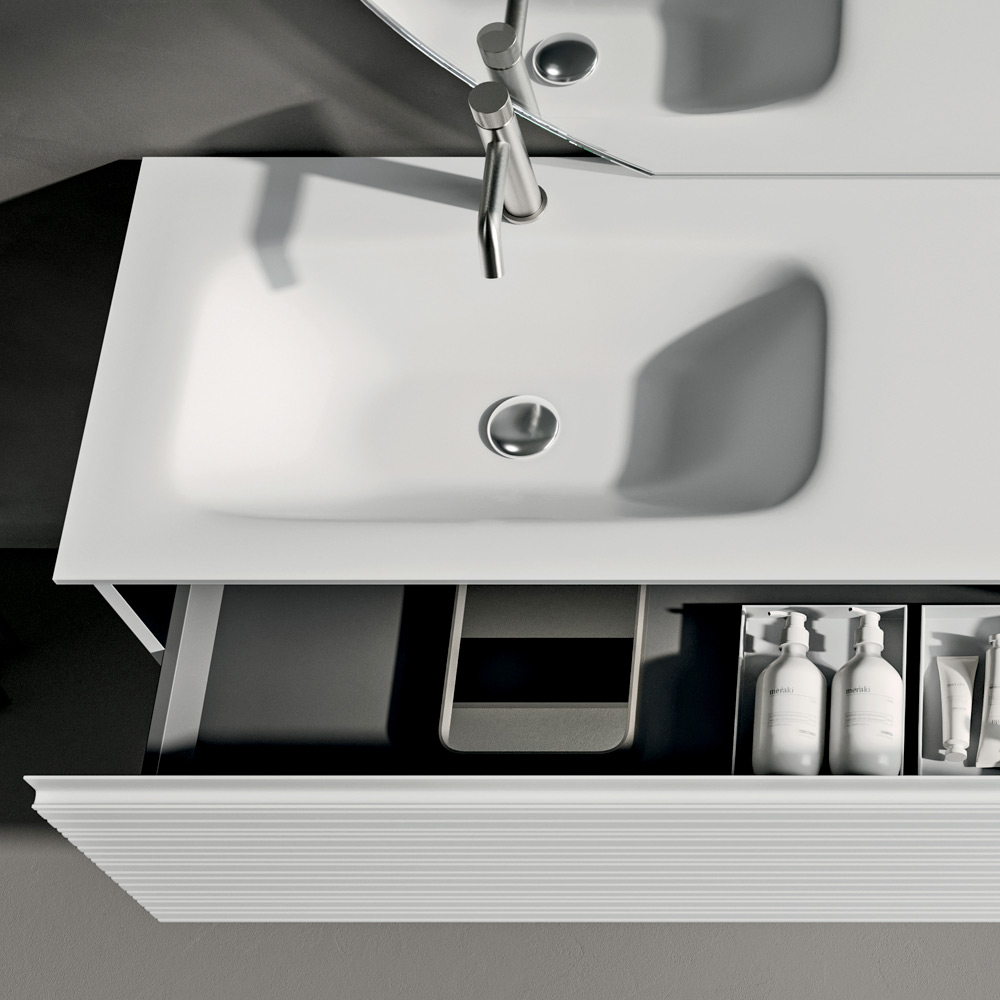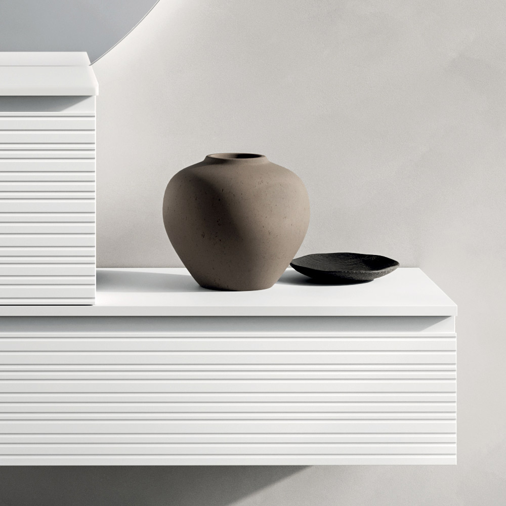 Een modern badkamermeubelconcept dat minimalistische esthetiek, hoogwaardige materialen en visueel comfort combineert, ideaal voor wie een elegante, lichte en tijdloze badkamer wenst.