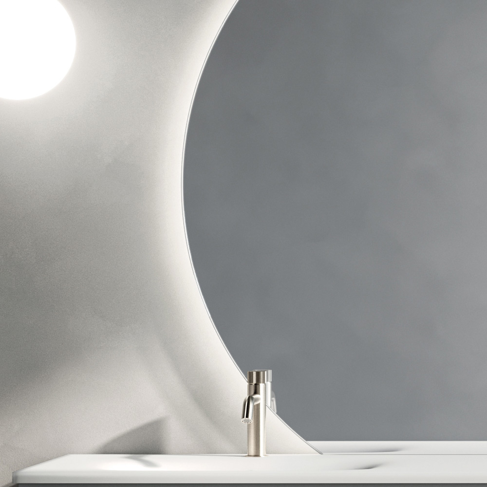 De ronde LED-spiegel maakt het geheel compleet. Deze verspreidt een zacht, gelijkmatig licht, waardoor de functionaliteit van de wastafel wordt vergroot en een uitnodigende, ontspannen sfeer ontstaat.