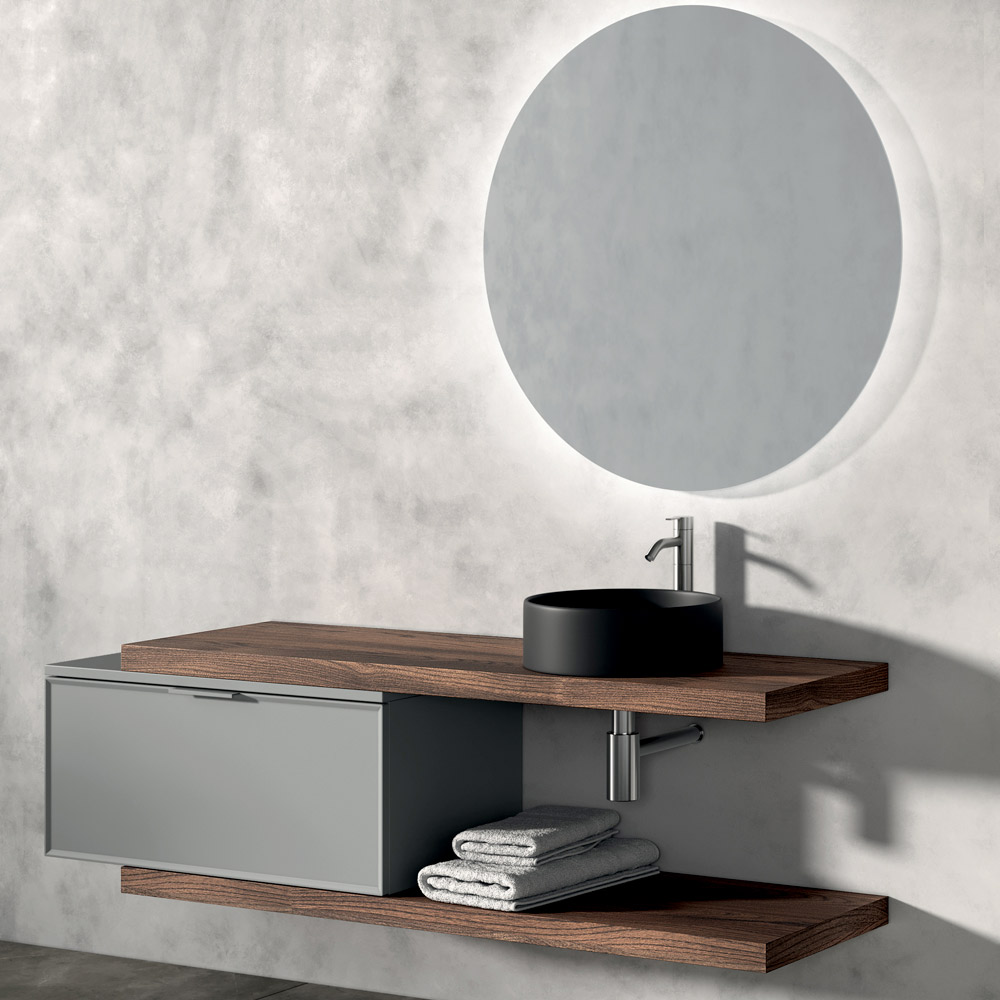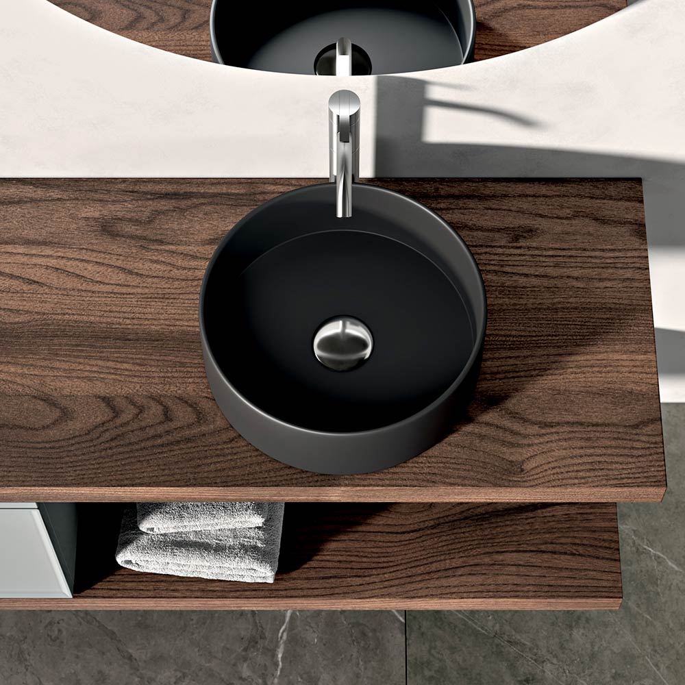 De twee Rio eikenhouten bladen voegen een natuurlijk en warm element toe en creëren een aangenaam materiaalcontrast met de ronde wastafel van matzwart keramiek , de ware visuele blikvanger van het geheel.