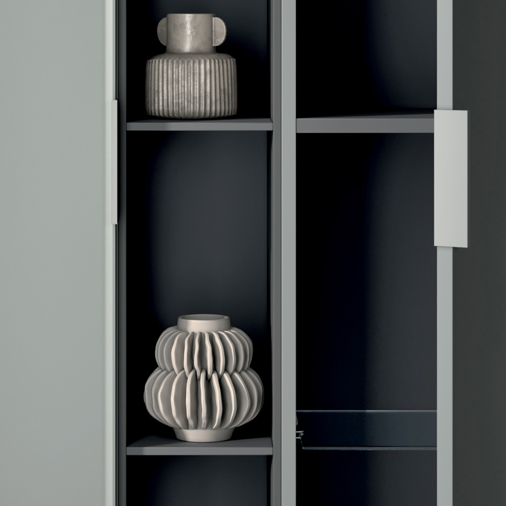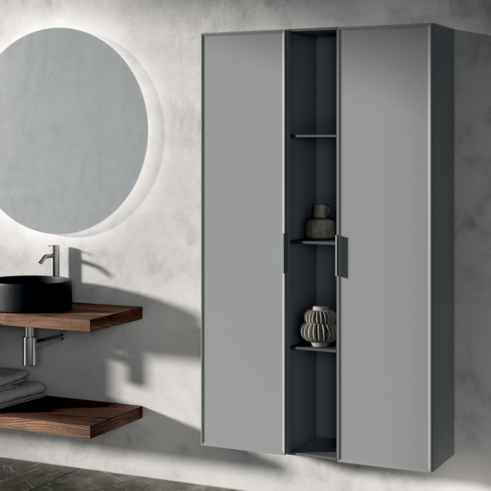 De compositie wordt verrijkt door verticale opbergzuilen en een antracietkleurig open element , perfect voor het opbergen van accessoires en objecten, met behoud van een nette en eigentijdse stijl.
