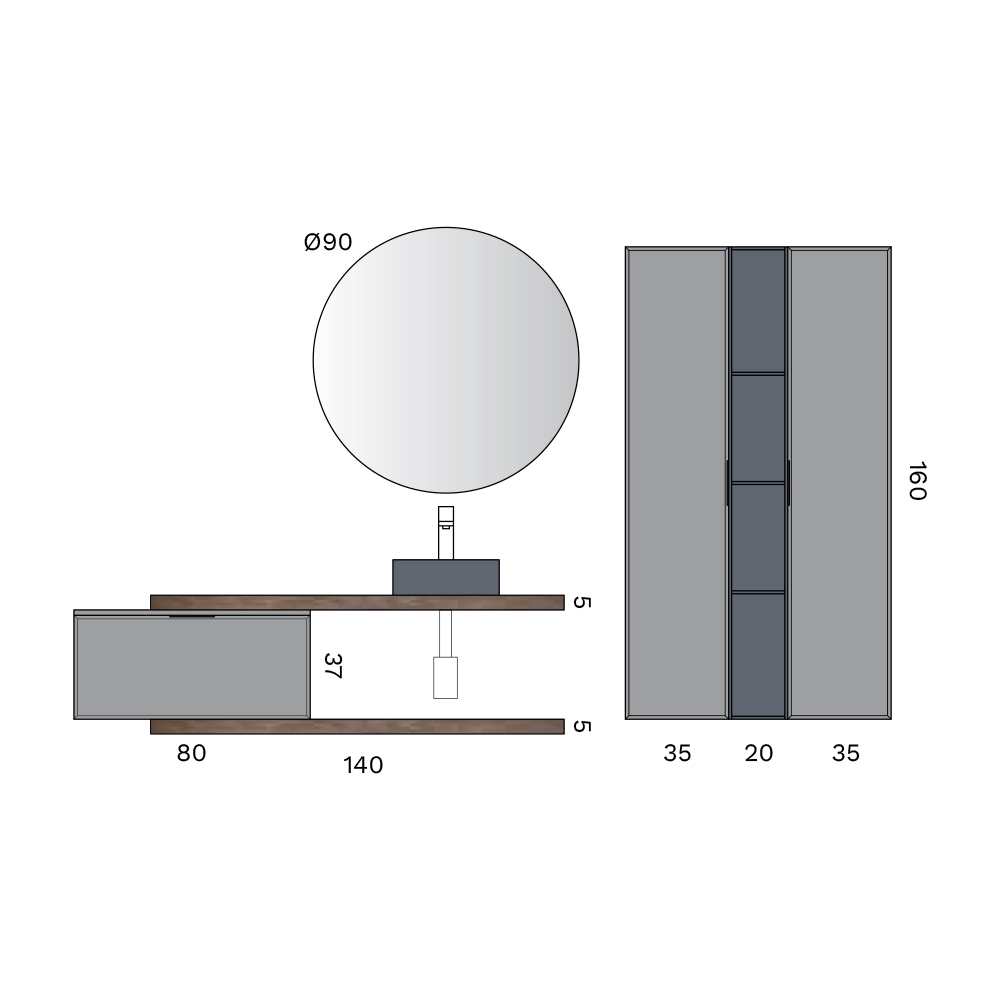 Een verfijnde, eigentijdse badkamercompositie met een elegant contrast tussen donkere oppervlakken, houten details en minimalistische vormen. Een ontwerp voor moderne badkamers met een sterk architectonisch karakter.