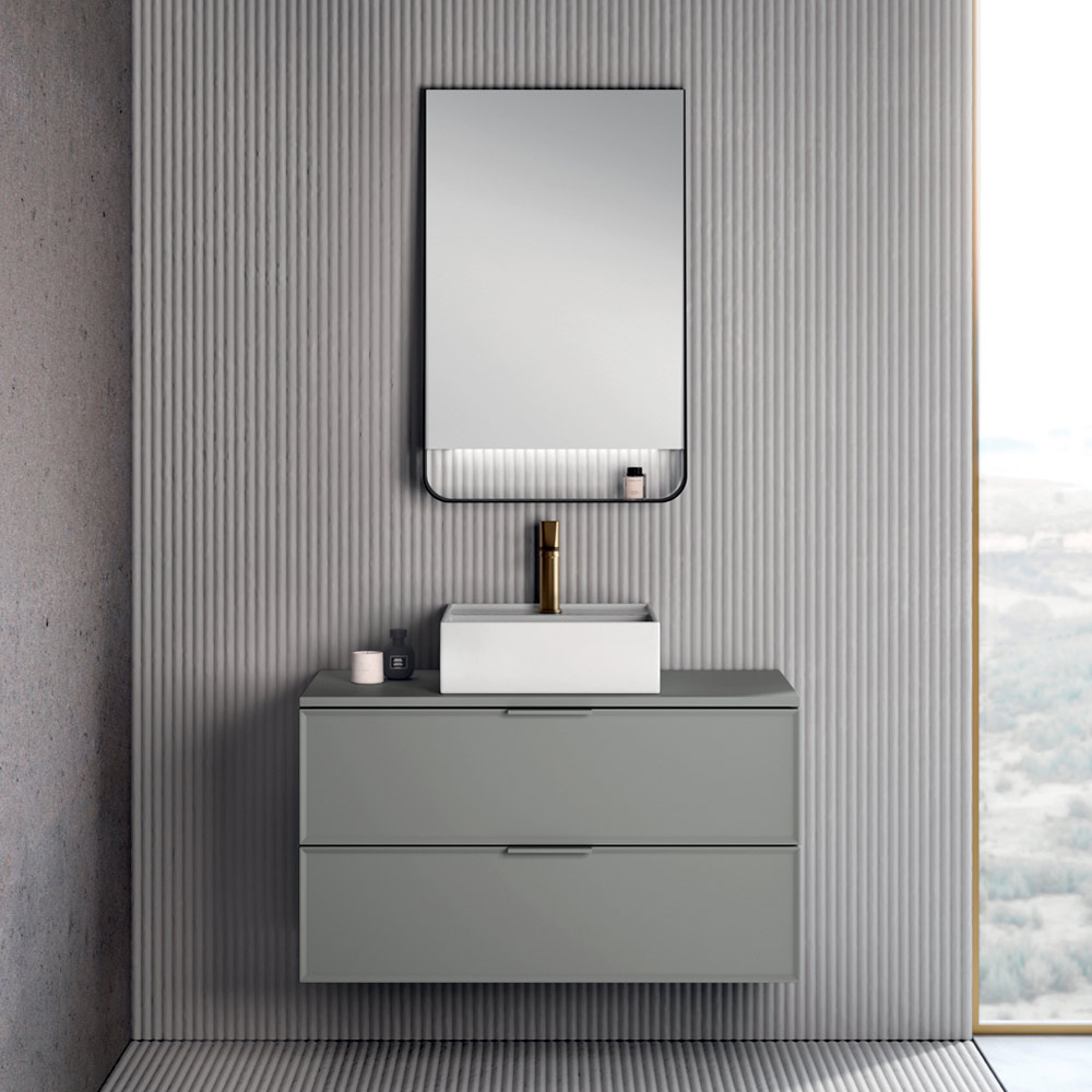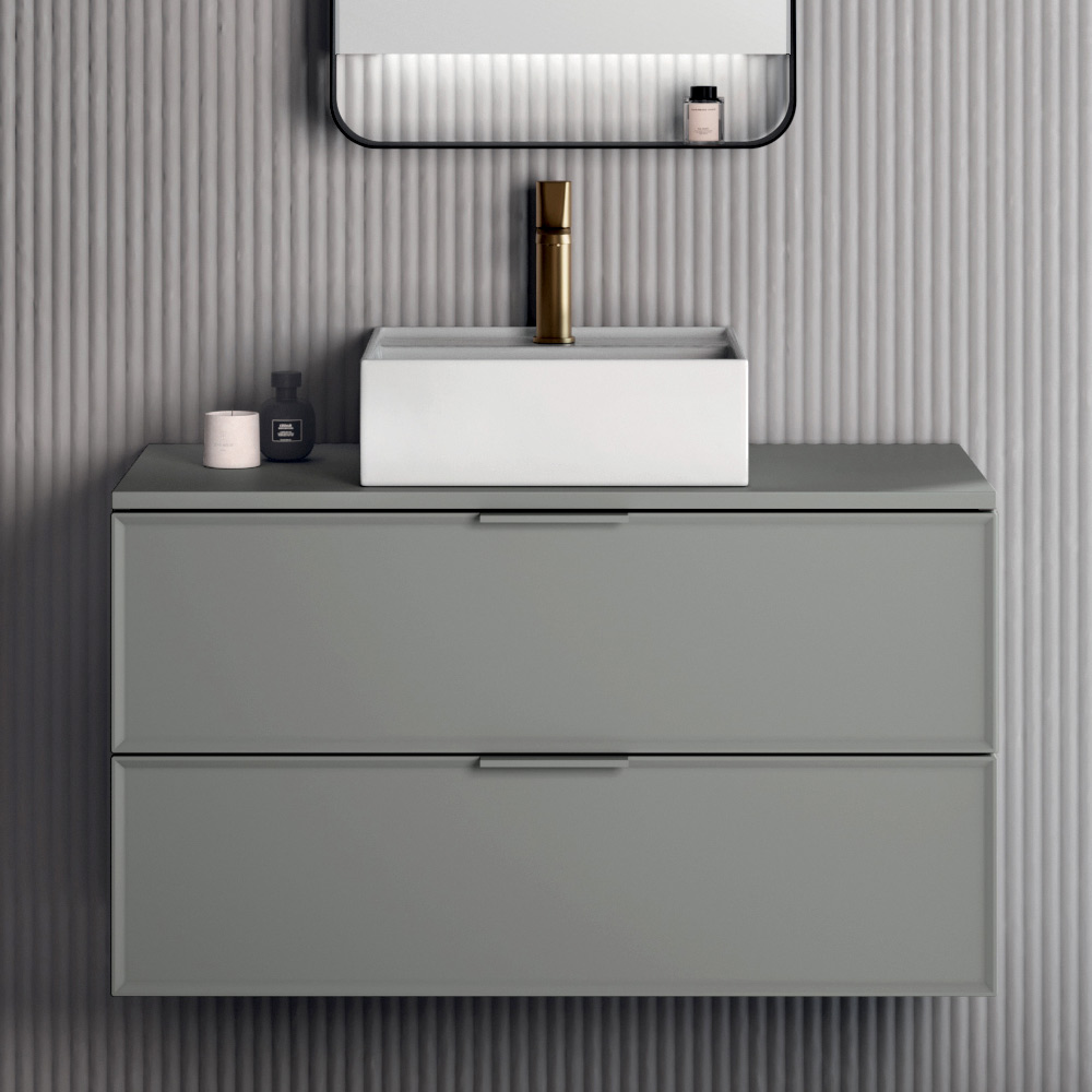 Een verfijnde, moderne badkamercompositie met een eenvoudig en elegant karakter, ideaal voor eigentijdse en minimalistische ruimtes. De matgrijze afwerking geeft een gevoel van soberheid en veelzijdigheid en past zich gemakkelijk aan diverse interieurstijlen aan.