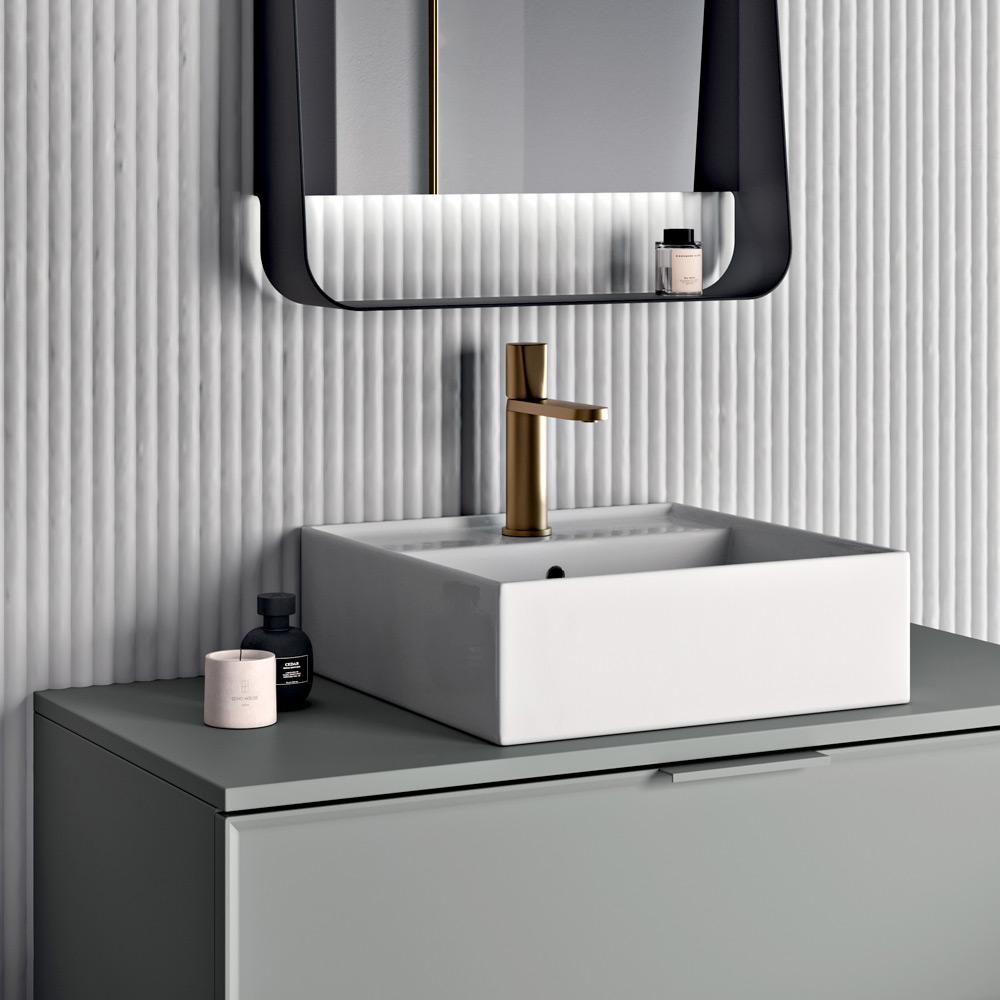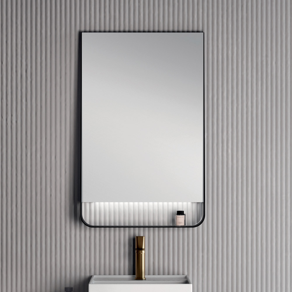 De Wing LED-badkamerspiegel met matzwart frame completeert het geheel; een element met een sterke persoonlijkheid dat zorgt voor functionele en tegelijkertijd decoratieve verlichting, waardoor de gehele wastafelomgeving wordt verfraaid.