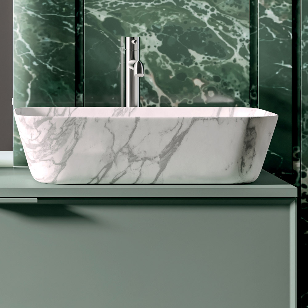 De wastafel met Calacatta-effect, gemaakt van keramiek, voegt een waardevol materiaalelement toe, met delicate aderen die doen denken aan natuurlijk marmer en de gehele badkamerinrichting verfraaien.