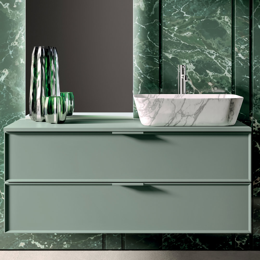 Een verfijnde badkamerinrichting met een modern design , gekenmerkt door strakke lijnen en een natuurlijk, rustgevend kleurenpalet. De matte saliegroene afwerking geeft de ruimte een eigentijdse en elegante uitstraling, perfect voor trendy badkamers .