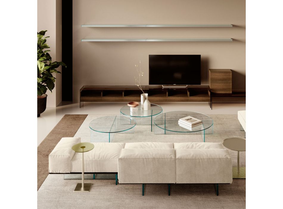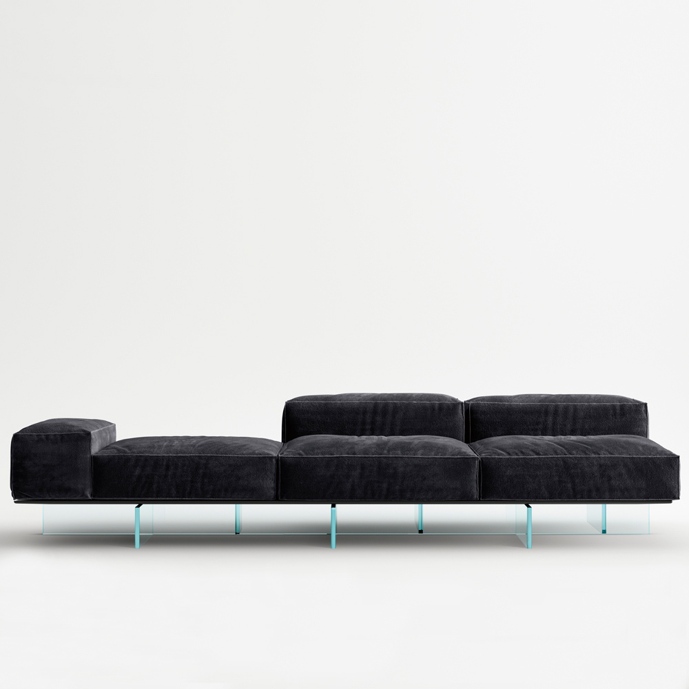 2-zits zitbank met poef gemaakt met een dragende structuur in blokplaat op onderstellen in extra helder gelast en gelaagd glas van 20 mm dik . Zitting en rugleuning bekleed met polyurethaanschuim met variabele densiteit met matras van nietjes van acrylvezel en bedekt met beschermende stof. De buitenbekleding is van verwijderbare stof met zichtbare dubbele stiksels. Samengesteld uit zachte en royaal gecapitonneerde volumes, introduceert het zitsysteem een nieuwe manier om de leefruimte te ontwerpen, met elementen die originele, meer dynamische en informele composities mogelijk maken. De bank behoudt zijn visuele lichtheid dankzij het onderstel dat bestaat uit poten van gelamineerd glas die een houten platform ondersteunen waarop de gestoffeerde elementen rusten. Verfijnde stoffen van hoge kwaliteit en verfijnde details in de verpakking zijn de onderscheidende kenmerken van een project met een onconventioneel karakter.