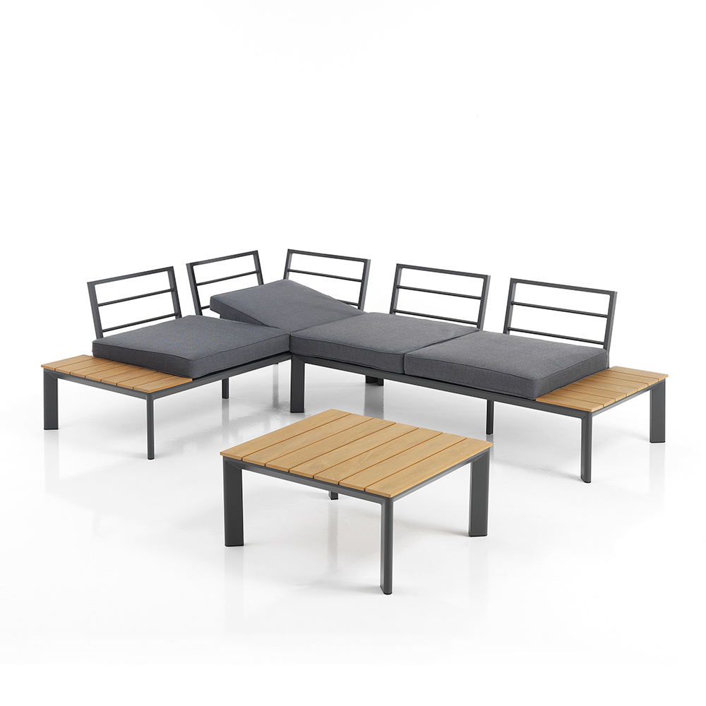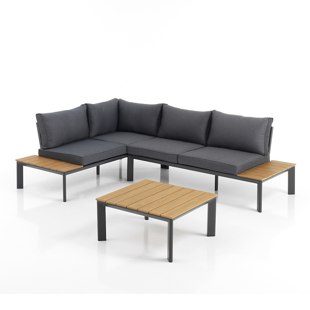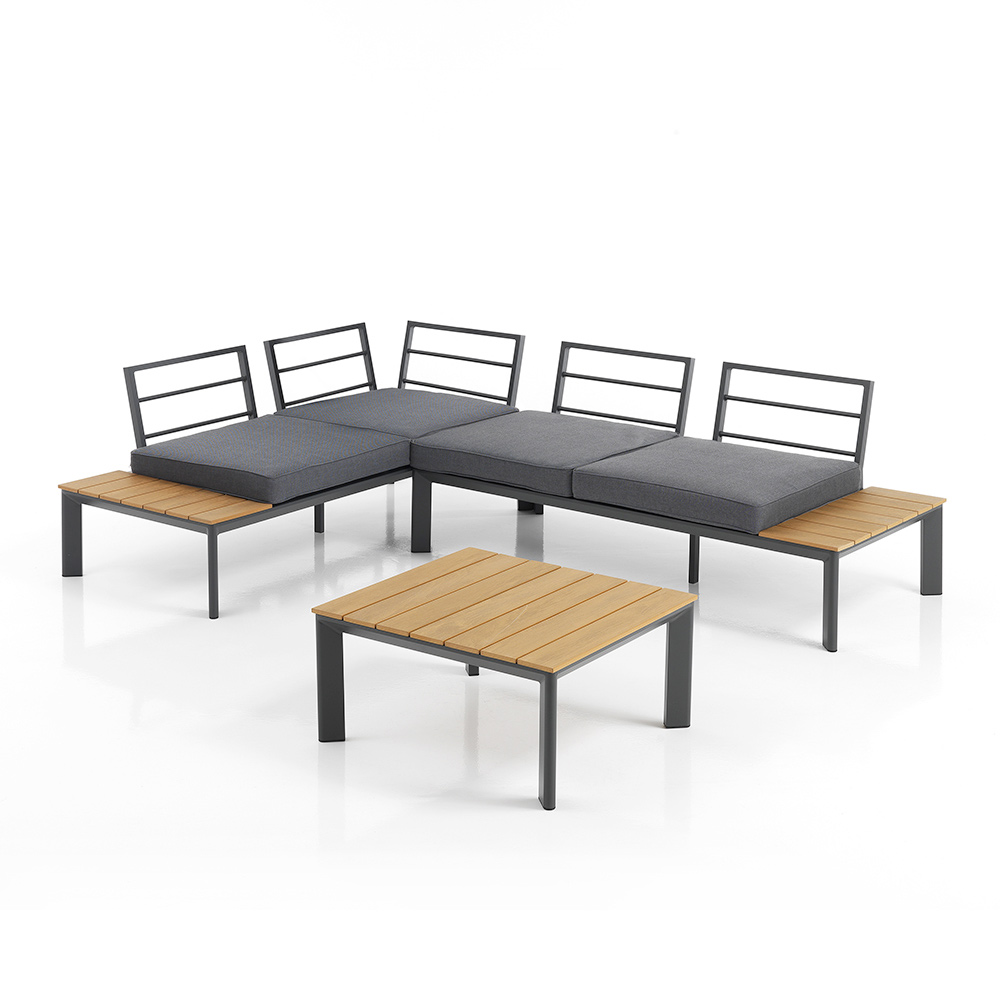 Deze tuinlounge met salontafel belichaamt betaalbare luxe en veelzijdig design . De unieke combinatie van aluminium en polywood biedt een strakke, eigentijdse esthetiek die naadloos past in zowel moderne als traditionele ruimtes. De grijze polyester kussens zorgen niet alleen voor subliem comfort, maar voegen ook een vleugje verfijnde eenvoud toe aan de set.