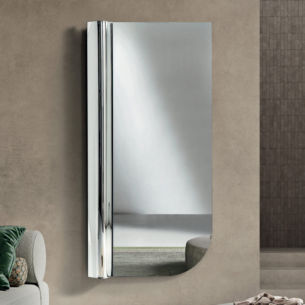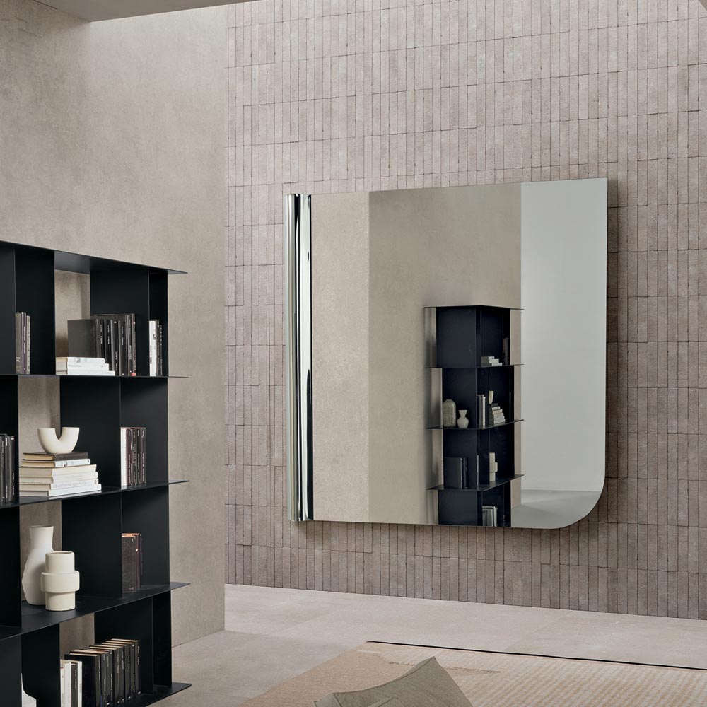De balans tussen subtiele asymmetrie en strakke lijnen maakt deze spiegel tot een verfijnd woonaccessoire, dat de muur kan verrijken met een modern grafisch element en de ruimte optisch kan verlichten.
