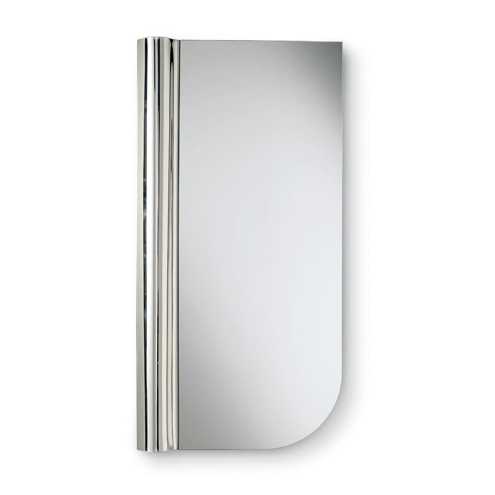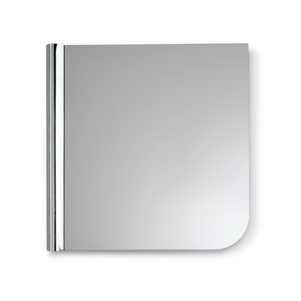De vorm van de spiegel wordt gekenmerkt door strakke lijnen met een afgeronde hoek die het profiel van het glas verzacht. In contrast met deze essentiële geometrie loopt een golf van gesmolten glas langs één verticale zijde, een gestructureerd detail dat dynamiek aan het oppervlak verleent en een elegant spel van licht en reflecties creëert.